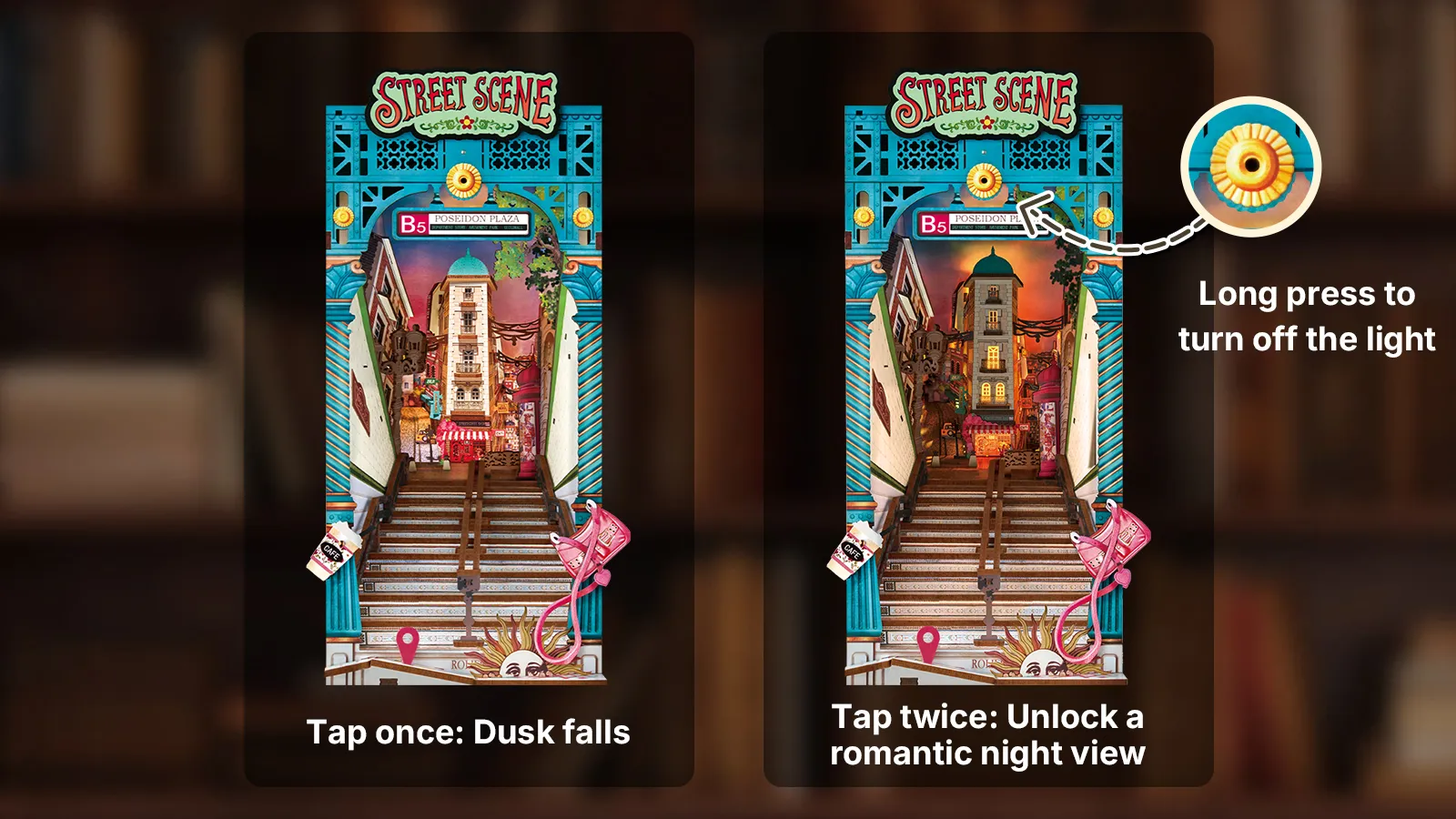Unlike most DIY book nooks with single brightness options, the Rolife Street Scene features 3-level dimmable lights (bright/medium/off).