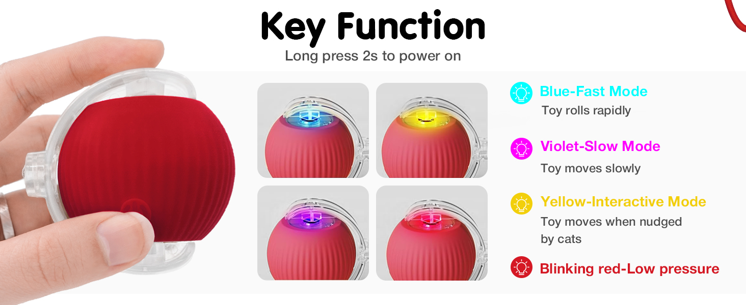 - Three Working Mode:The Interactive Ball Toy built-in fast mode(Blue lights), slow mode (Purple lights) , interactive mode (Yellow lights).Three modes short press to switching working mode, and distinguish via the color of the light.