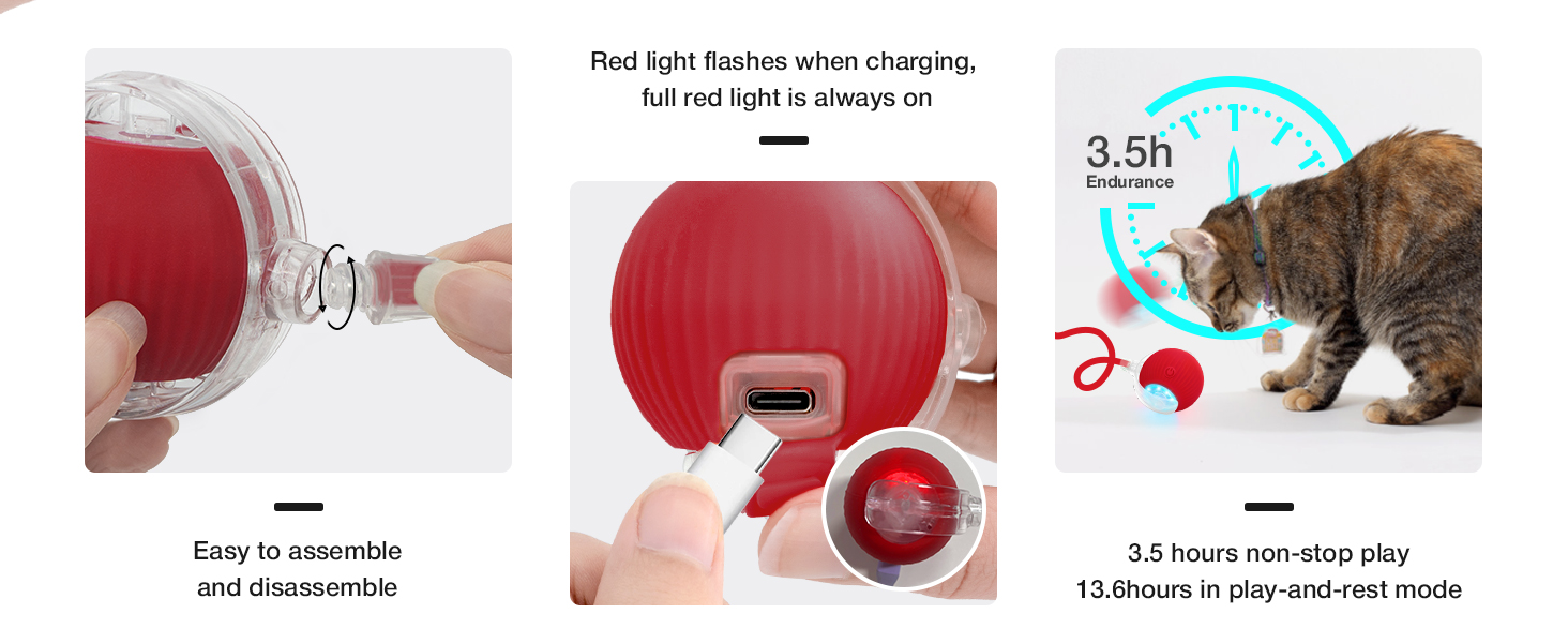 - Quick Charging:The interactive cat toy can support a longer game time.The Electric Ball has built-in fast-charging technology that provides up to 4 hours of fun in just 30 minutes.