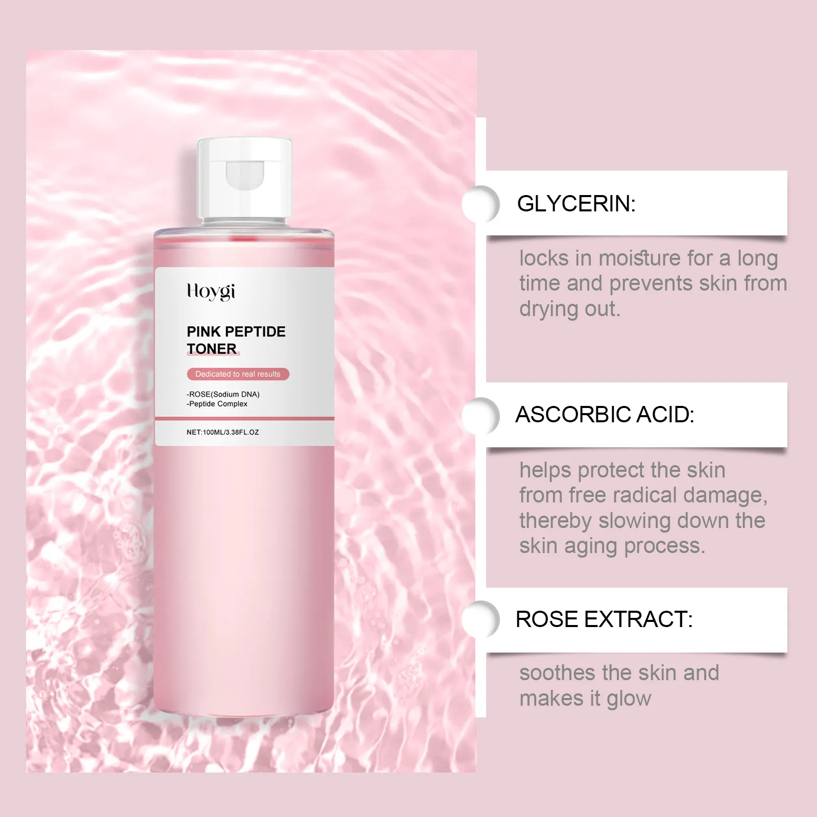 Ingredients: Water, glycerin, ascorbic acid (vitamin C), Rose