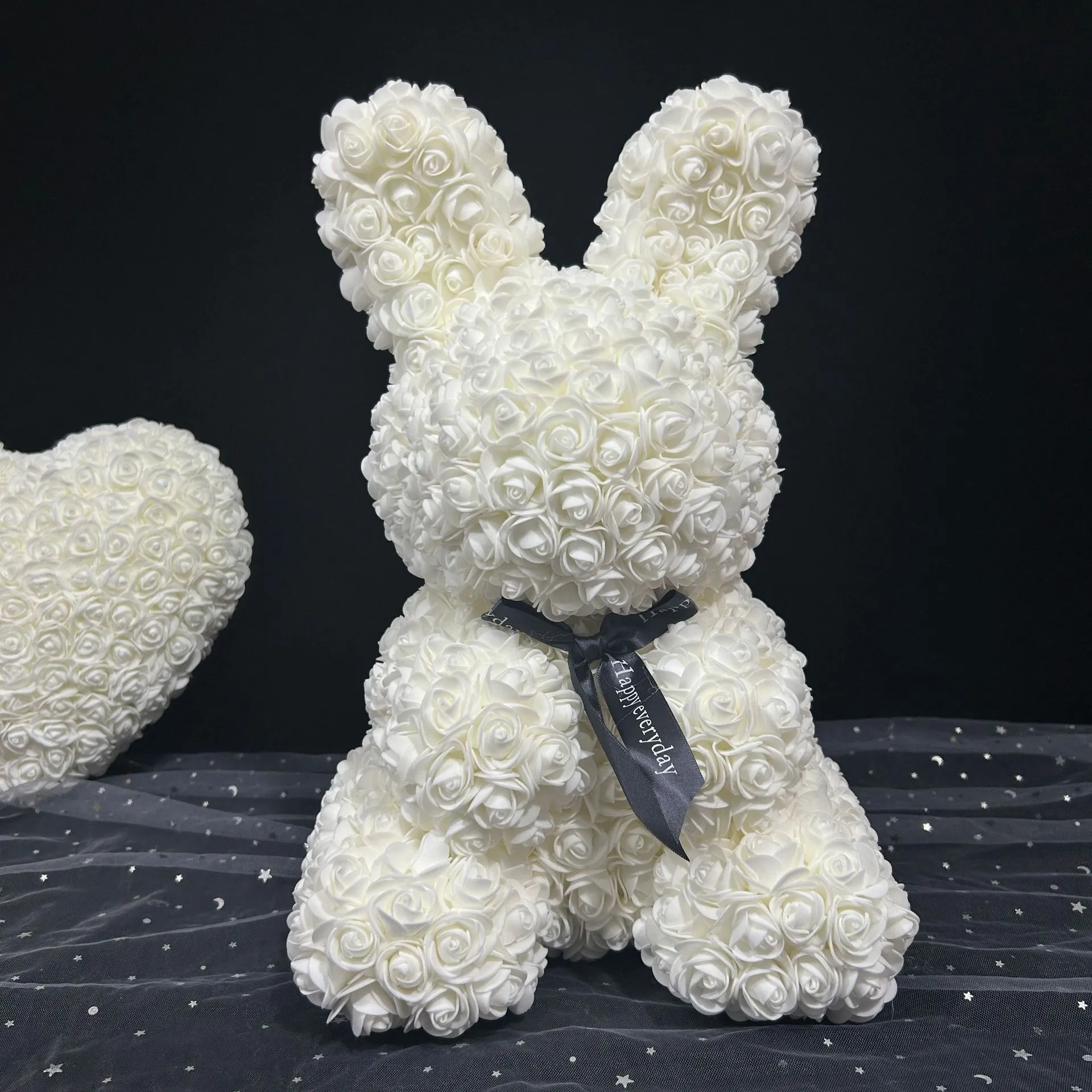 Artificial Roses: The roses that adorn the rabbit figure are made from high-quality artificial materials such as foam,