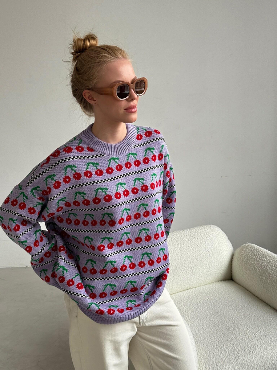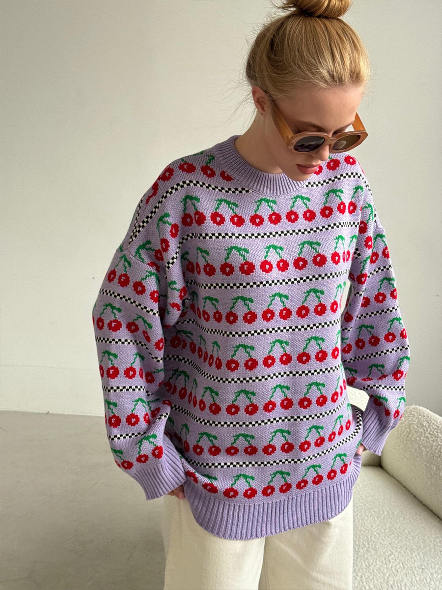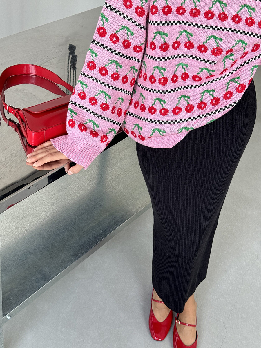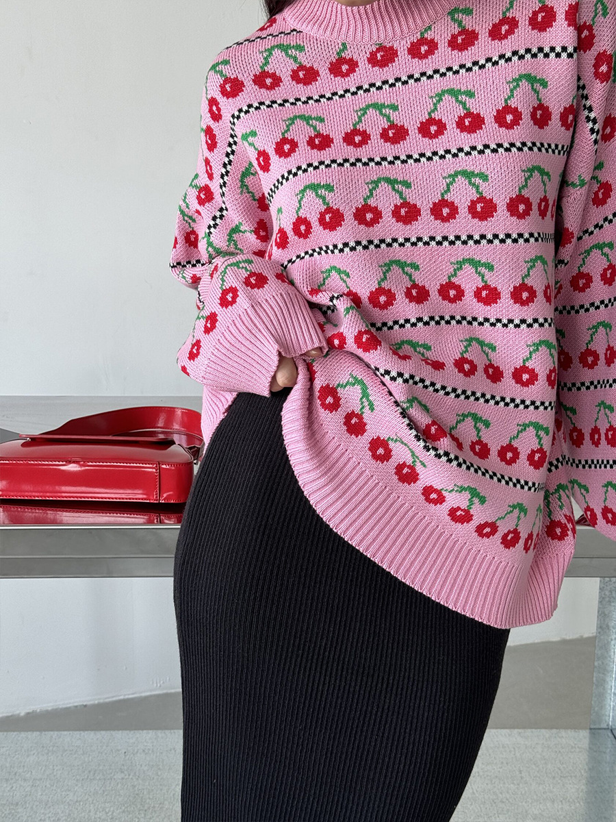 Round Neck Cherry Sweater Mid-length Retro