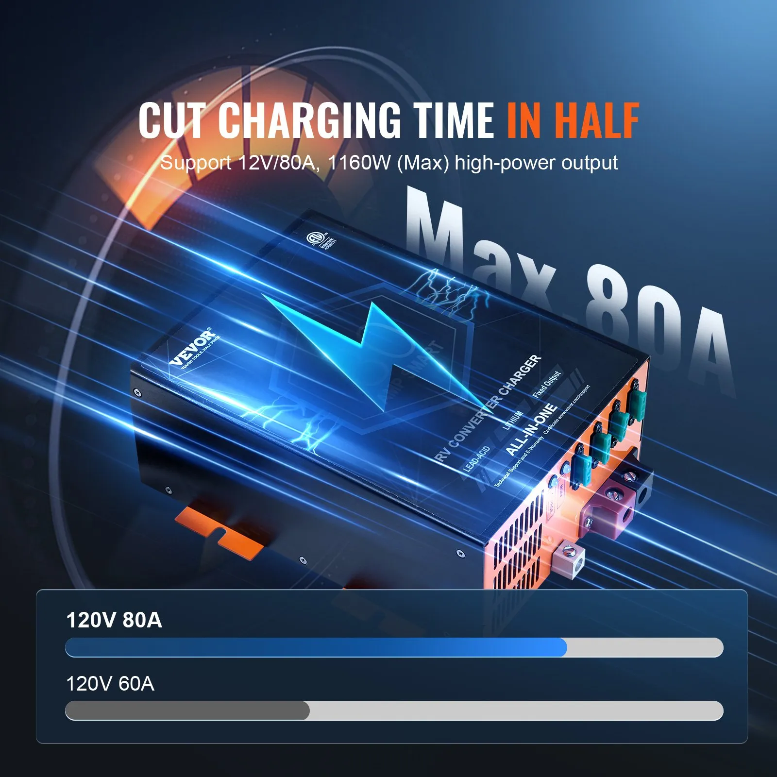RV Converter 80 Amp 110V AC to 12V DC with built-in battery charging capabilities, overcharge protection, and durable design for efficient