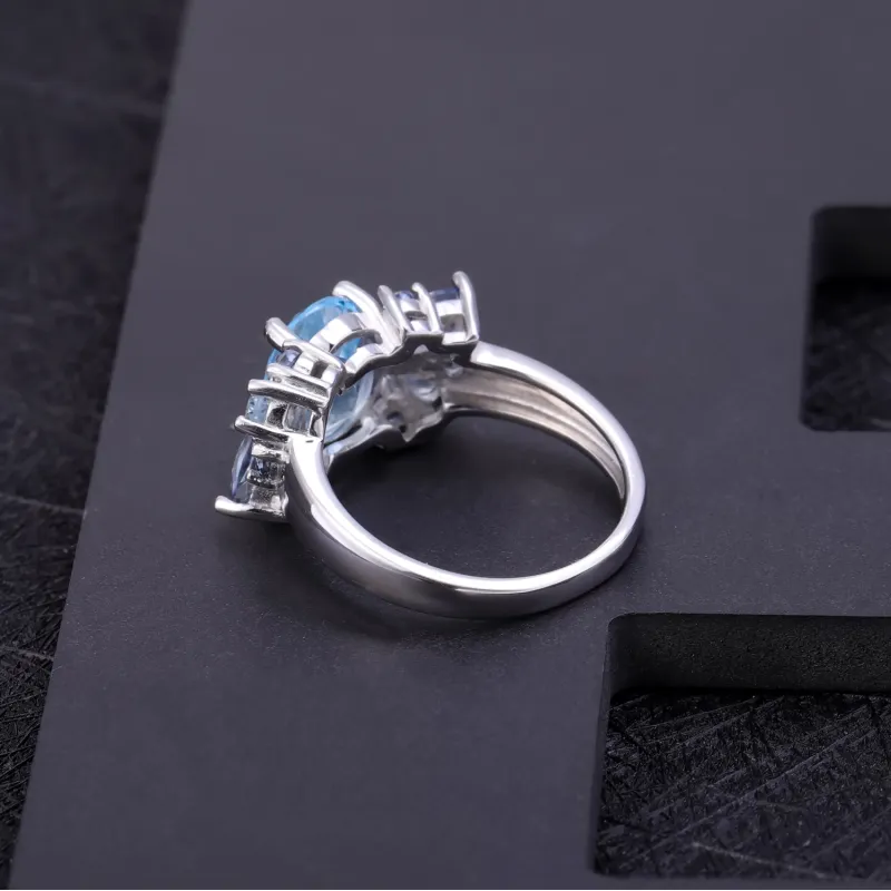The centerpiece of this ring is the radiant natural topaz gemstone, known for its brilliant blue hue and sparkling clarity. The topaz is meticulously cut to enhance its natural beauty, reflecting light from every angle. This gemstone not only adds a pop of color to your outfit but also symbolizes love and affection, making it an ideal gift for a loved one or a beautiful addition to your own collection.