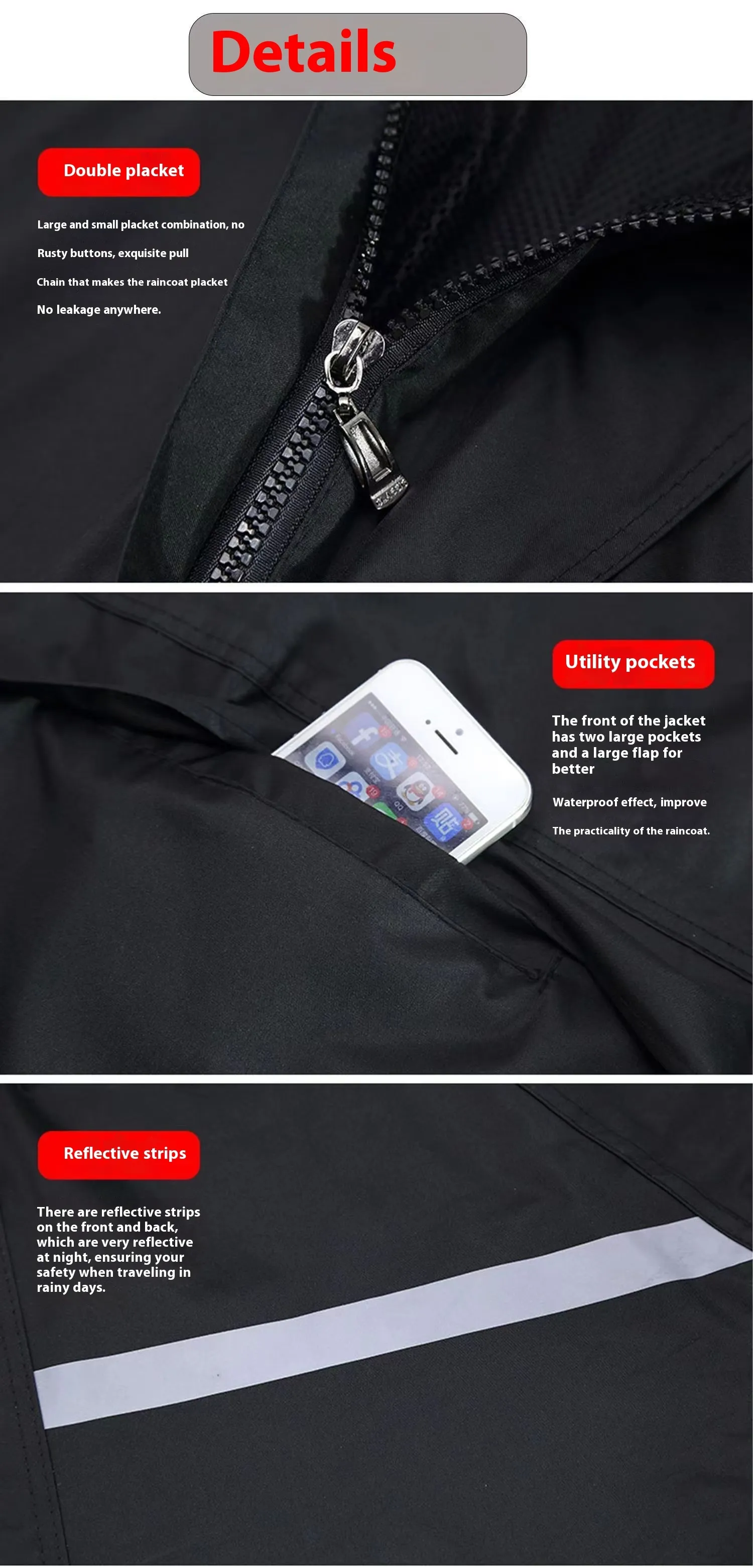 The raincoat features reflective strips for increased visibility, making you more noticeable to other drivers in low-light or rainy conditions, enhancing your safety on the road.