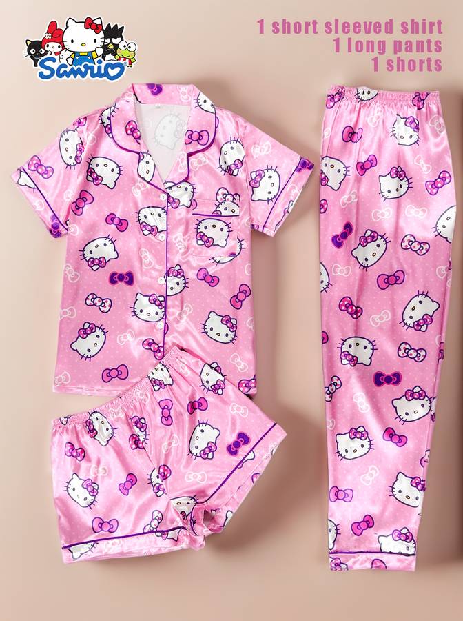 Sanrio HELLO KITTY Youth Pajamas 3-Piece Set – Lapel Buttoned Cardigan Top + Trousers + Shorts