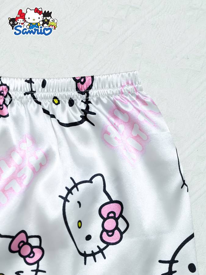 Made with a soft satin-feel woven fabric using 97% polyester and 3% elastane, the set offers a smooth, lightweight texture with just enough flexibility for all-season comfort. The adorable Hello Kitty cartoon print adds a playful touch that makes the set fun to wear for relaxing at home, sleepovers, pajama parties, or weekend lounging.