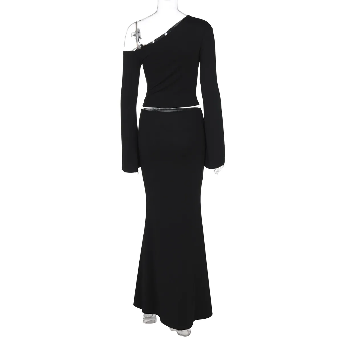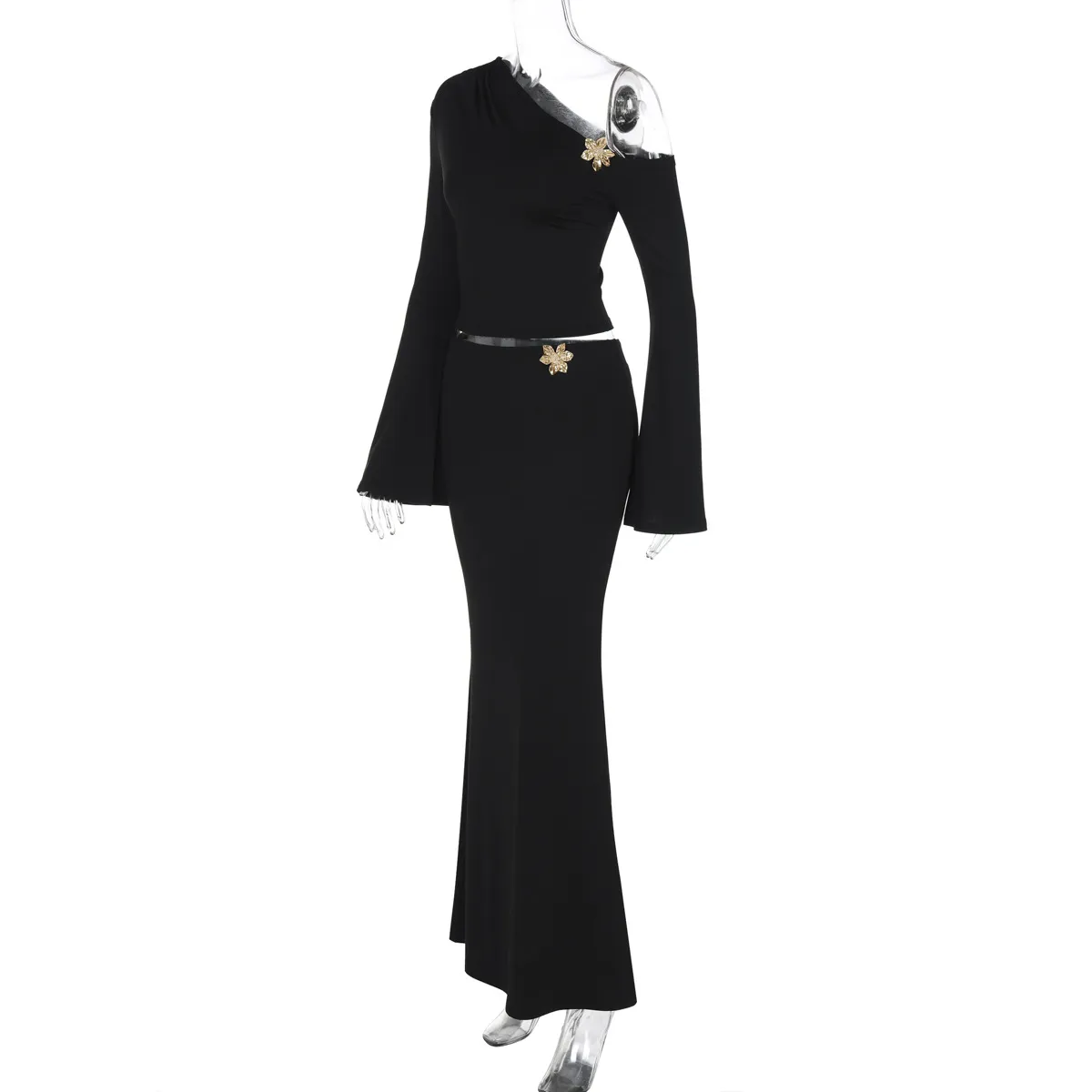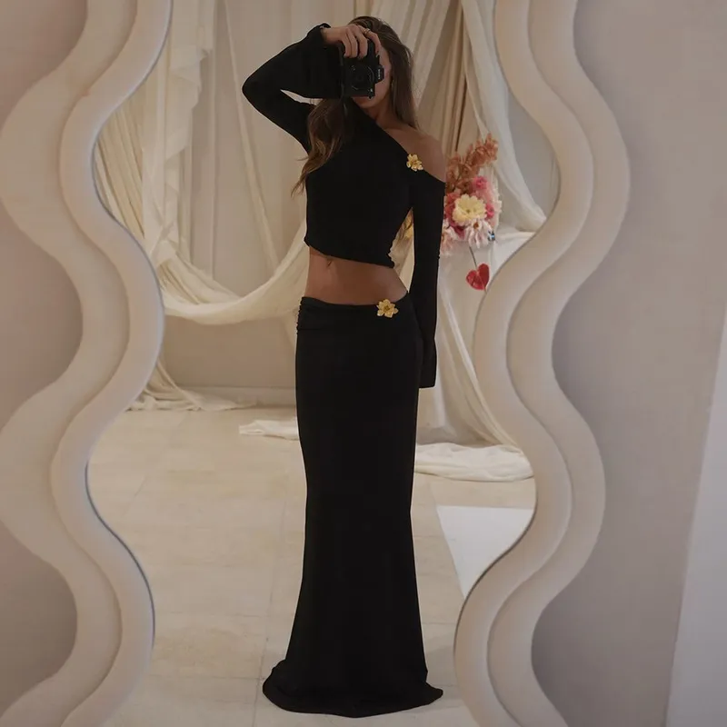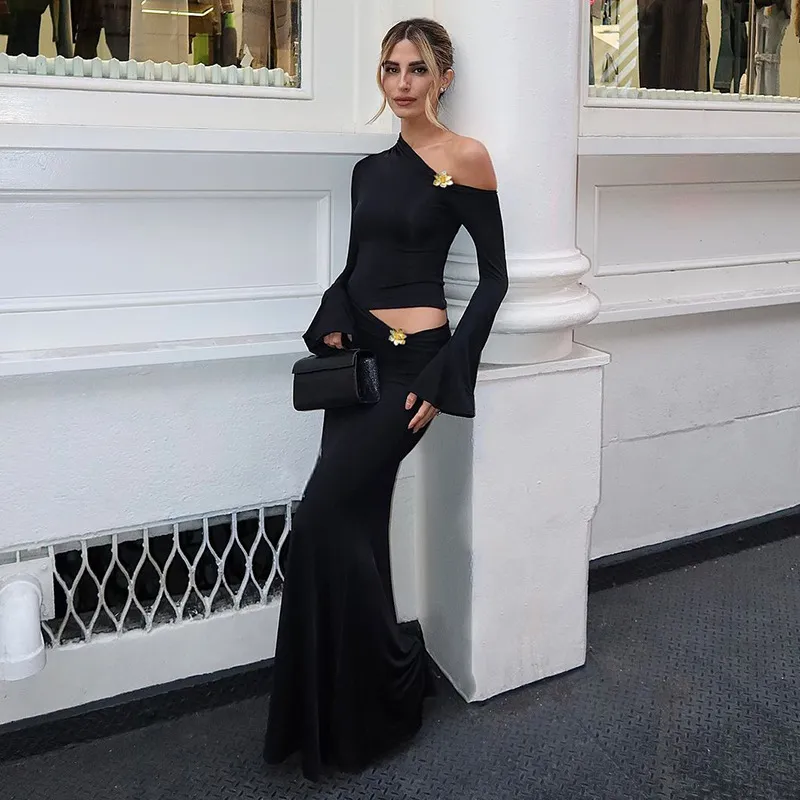 Sexy Slim Oblique Shoulder Skirt Suit With Flower Fashion Bell Sleeve Long Sleeve Top And High Waist Long Skirt Women Clothing