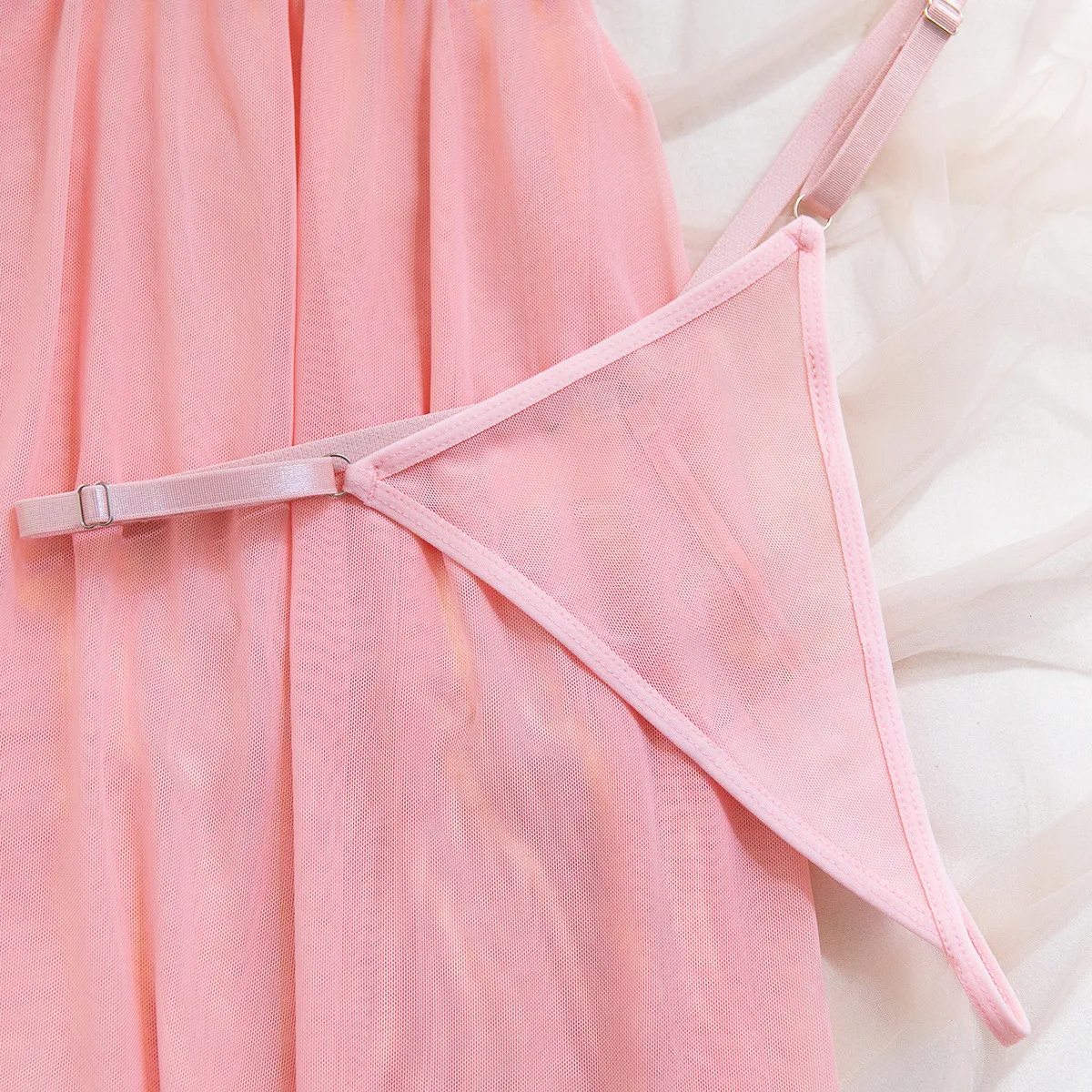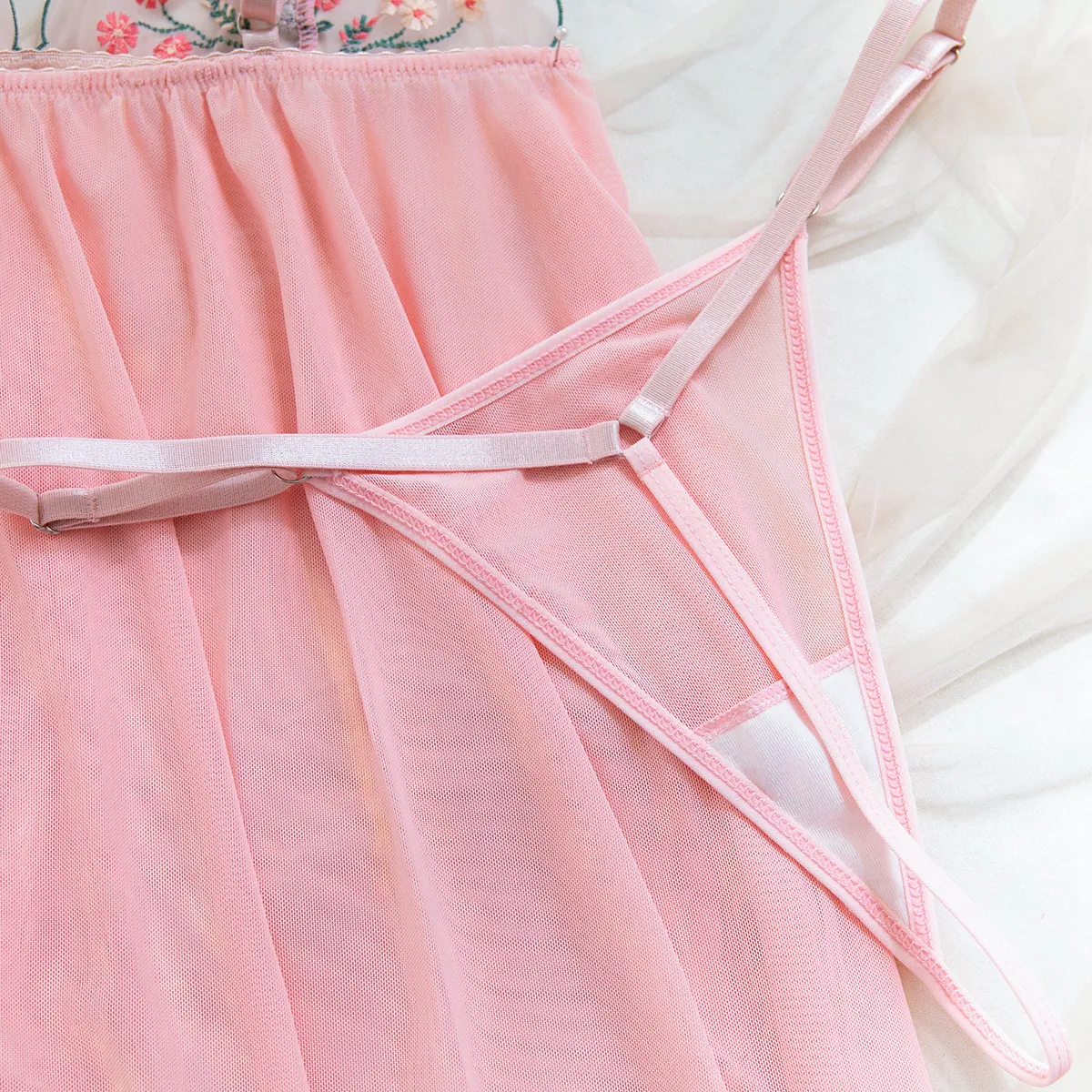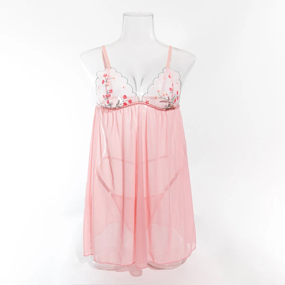 The transparent mesh material adds a touch of mystery and sophistication, while the fine embroidery highlights intricate details that enhance the overall aesthetic. The sling straps provide a flattering fit that accentuates your curves, making this set ideal for special occasions or intimate moments.