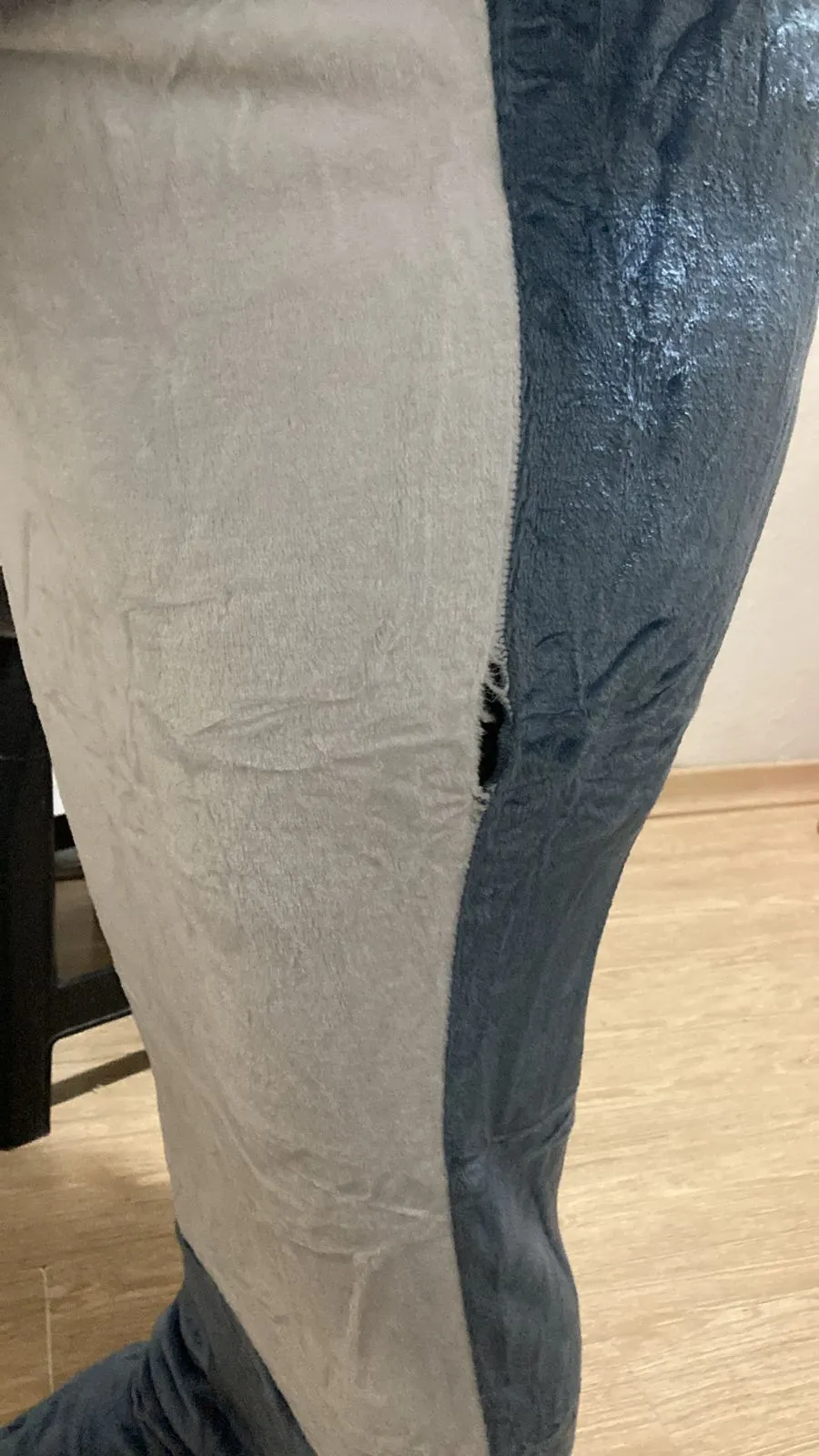 Is a very soft and warm blanket. The color is not a strong blue as in the pictures and even preferred so. I had no problems with sewing, but for those who buy: take a bigger size. I have 1,51 of height, which would be the s, but I took the m that was the available and it was right. In the end I got lucky.