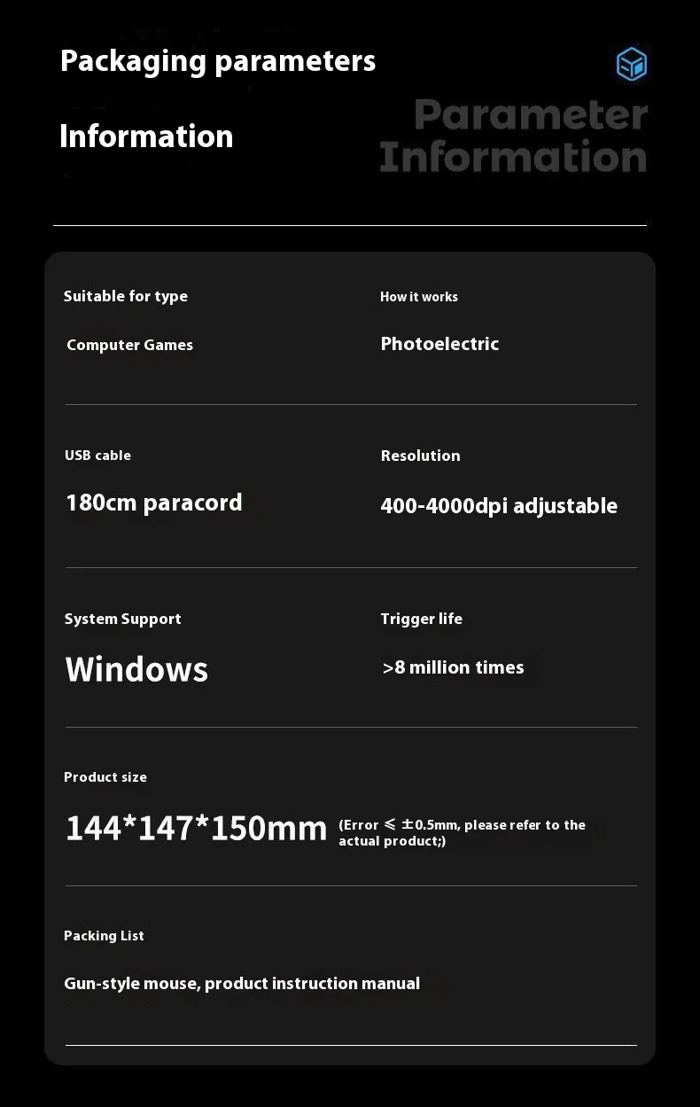 The Shooting Game Mouse Gun-Type Vertical Handle Grip Trigger combines ergonomic engineering with immersive realism. Its vertical pistol design, tactile trigger mechanism, and precision optical tracking create a gameplay experience that feels as intuitive as it is exciting.