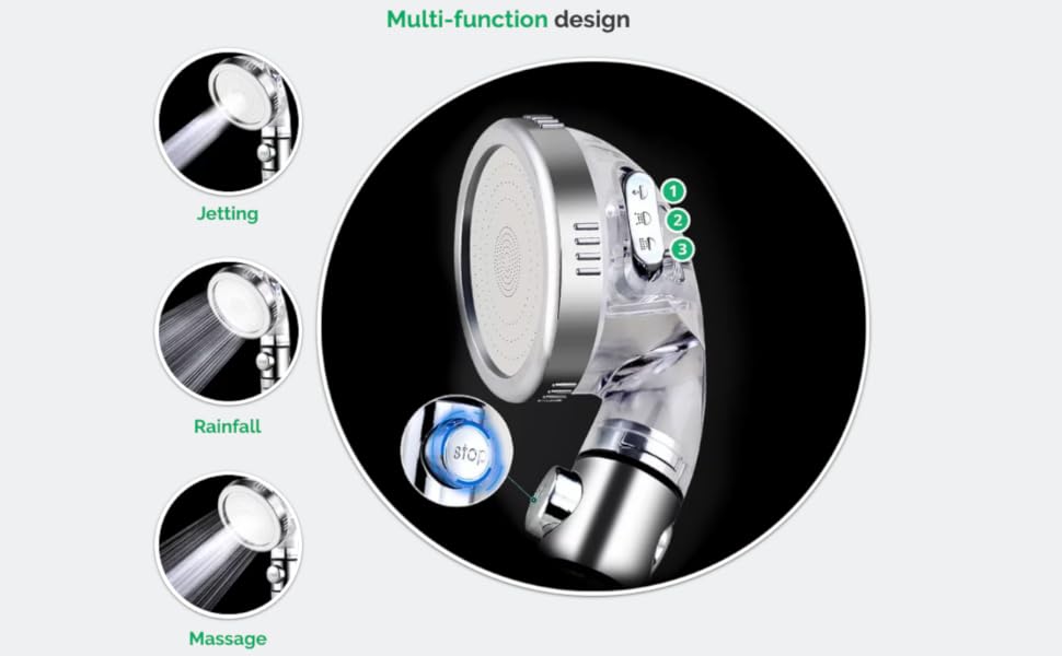 - 3-IN-1 SPRAY SYSTEM — Stone Stream shower head features three different spray functions: Rainfall, Massage & Jetting. The Eco-stop button maintains water temperature, with no need to use the water valve.