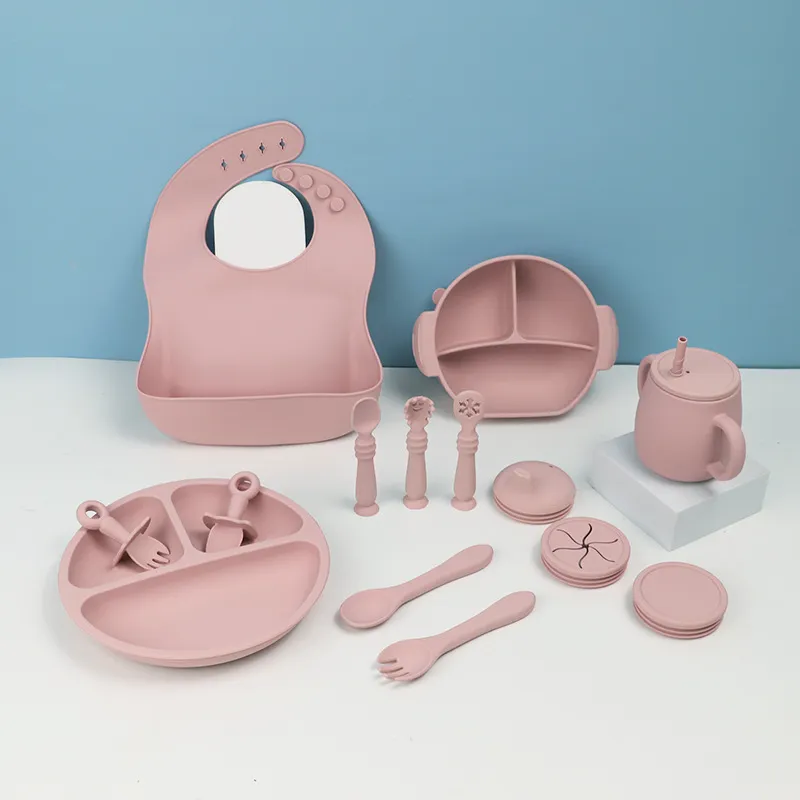 Silicone Children's Tableware Set Baby Feeding Solid Food Tableware Bib Suction Cup Bowl Spoon Plate Bib 15-piece Set