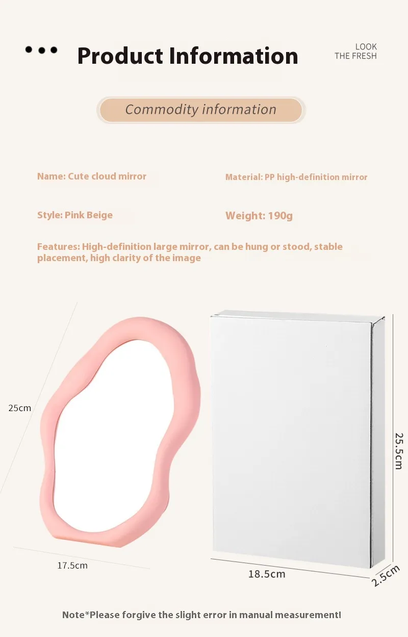 The Simple Desktop Cloud-Shaped Makeup Mirror is a charming, functional addition to any student dormitory or home. Designed in an adorable irregular cloud shape, this mirror not only adds a whimsical touch to your space but also provides the perfect reflection for makeup application, grooming, and everyday use. Its compact size makes it easy to fit on your desk or vanity, while its playful design brightens up any room.