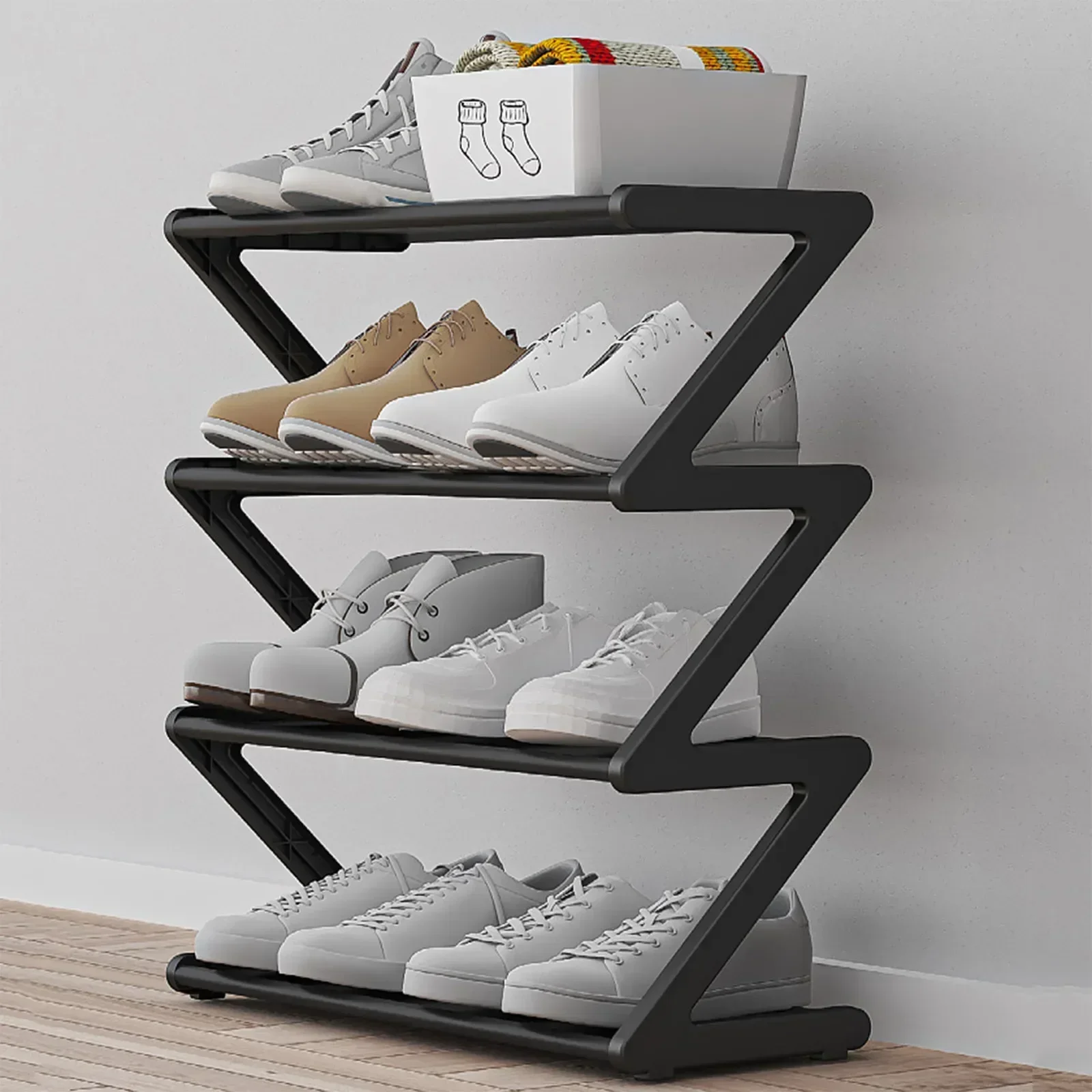 The fabric dust-proof cover ensures your shoes remain clean and protected from dirt and dust, making it perfect for use in entrances, closets, or bedrooms. With its sturdy frame and easy-to-assemble design, the Z-shaped shoe rack is the perfect storage solution for any home.