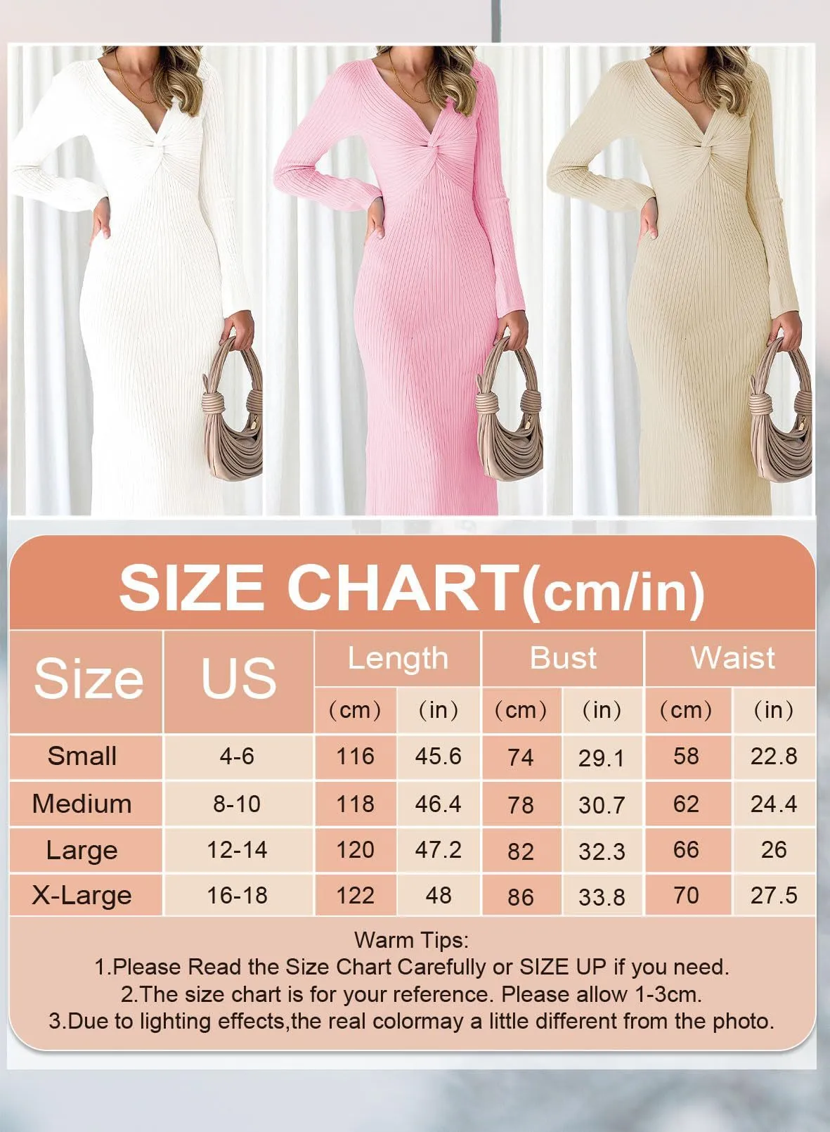 - Design: Knitted long dress, V-neck, long sleeves, medium length, solid color, ribbed knit, slim fit, sexy, twist Front, good drape, basic casual dress, bodycon sweater dress, elegant, slim midi dresses