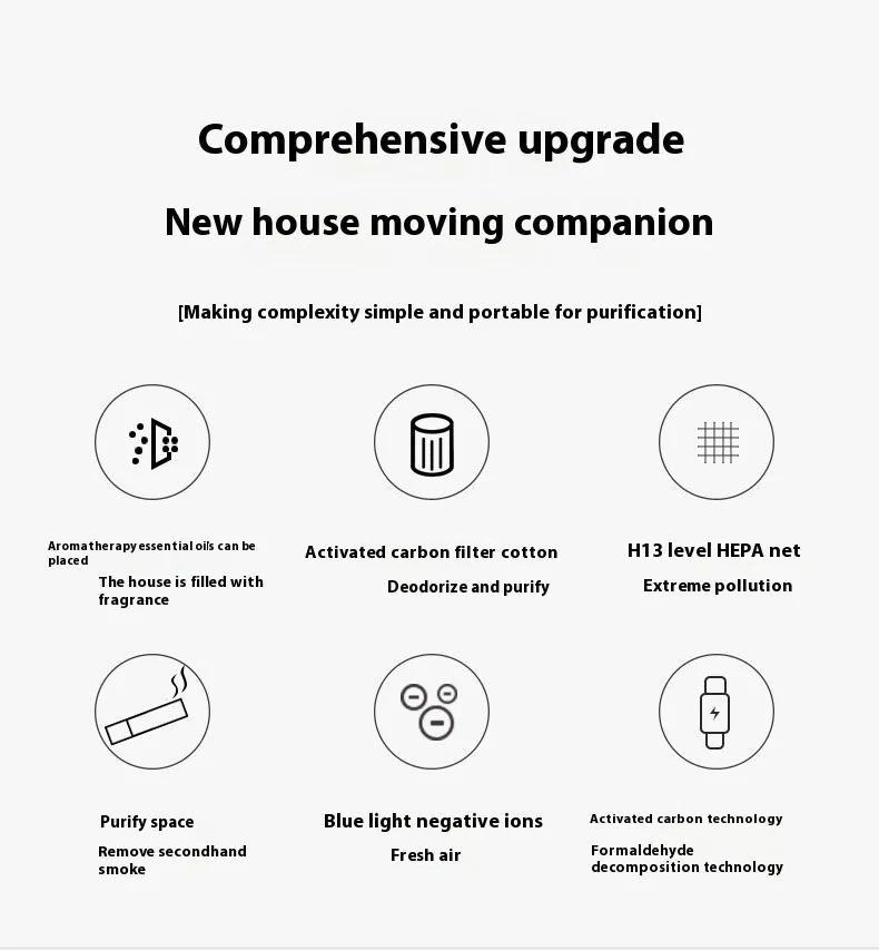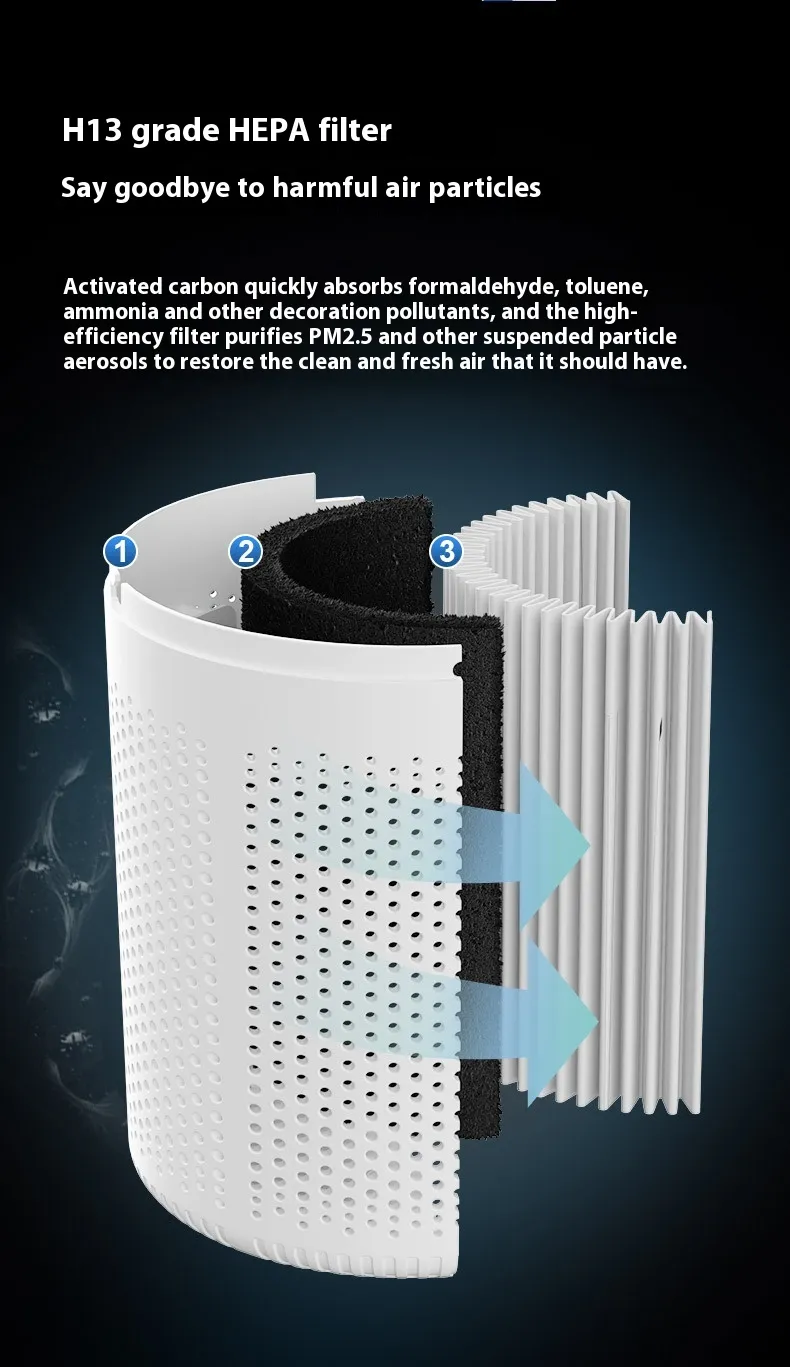 The Small Air Purifier features a dual‑stage or triple‑stage filtration system. The pre‑filter captures larger particles like dust and pet hair, while the HEPA‑grade filter tackles fine particles such as pollen, smoke, and allergens. Depending on model, an activated carbon layer may also neutralise odours and volatile organic compounds (VOCs).