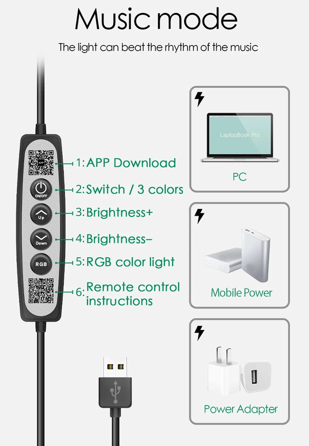 Power supply mode: 2 meters USB cable