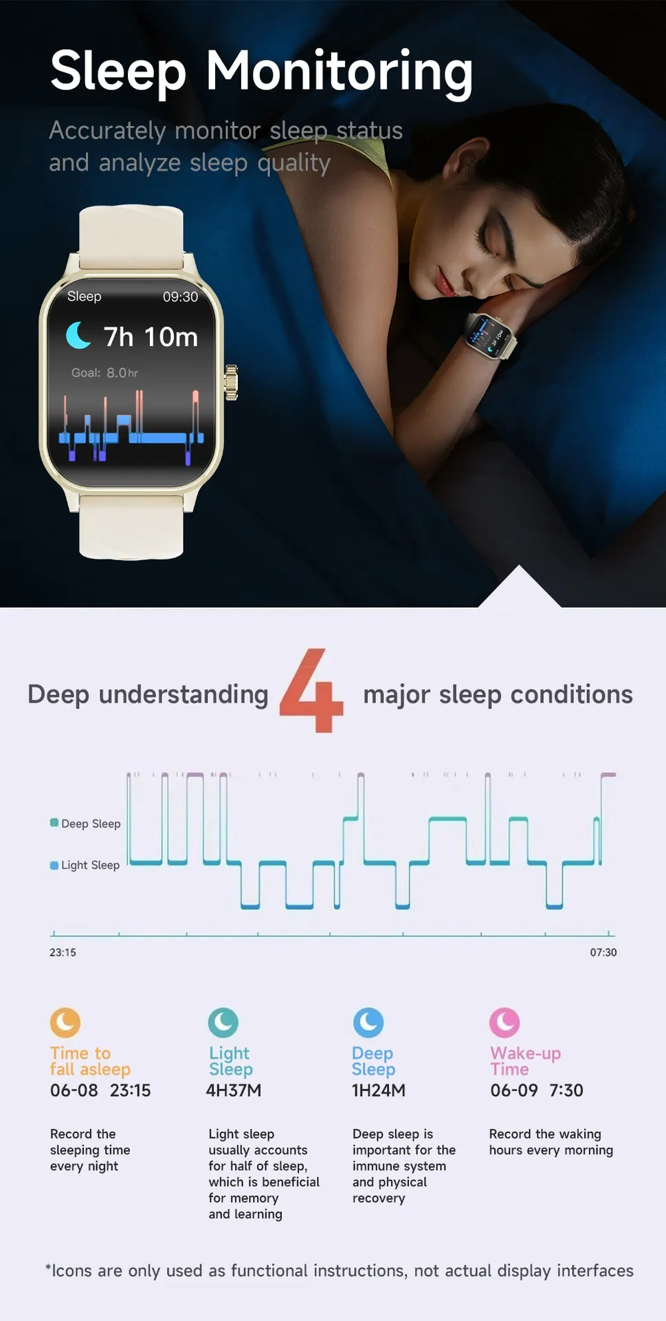call, smart reminder, remote control selfie, sleep monitoring, blood oxygen detection