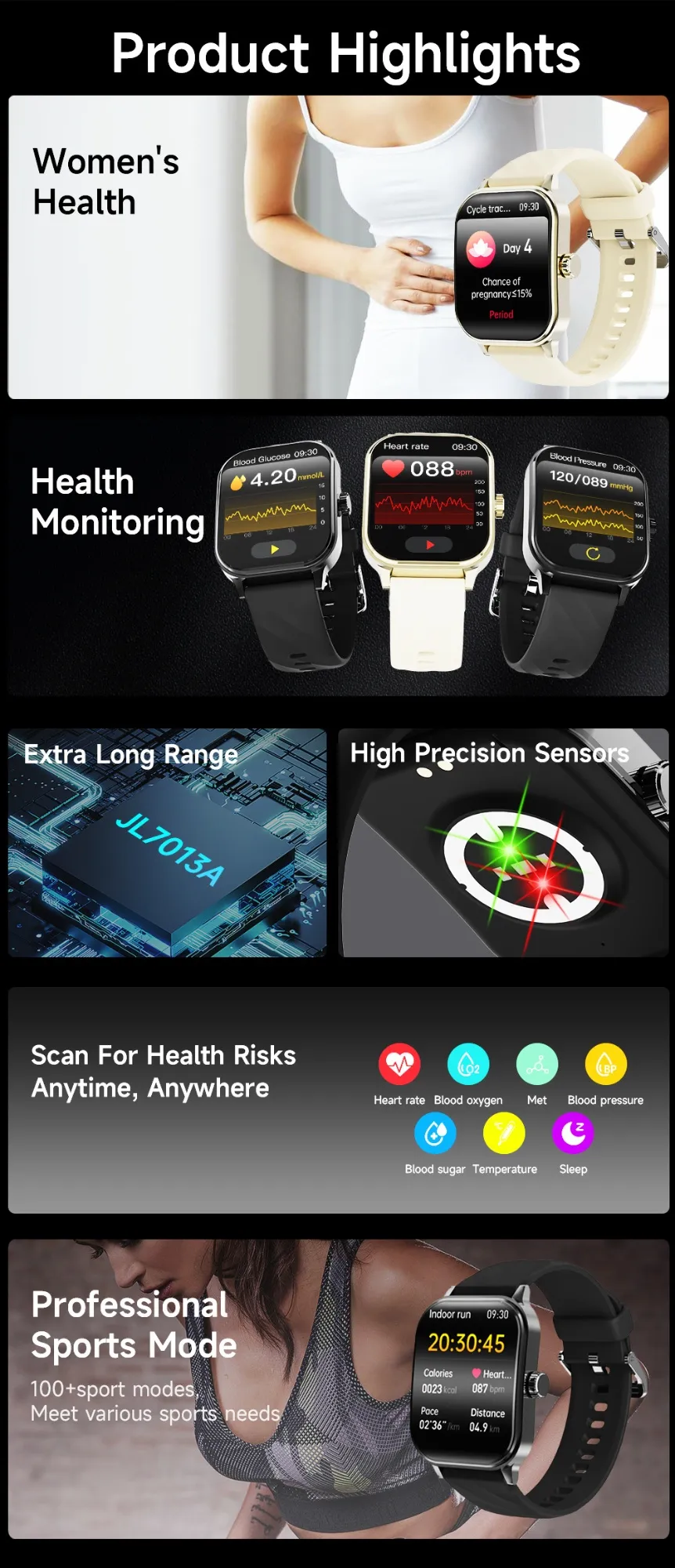 - Health Monitoring: Continuous heart rate, blood pressure, and blood oxygen tracking