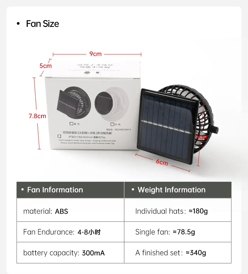 Long-Lasting Lithium Battery: The hat includes a long-lasting lithium battery that powers the fan when sunlight is