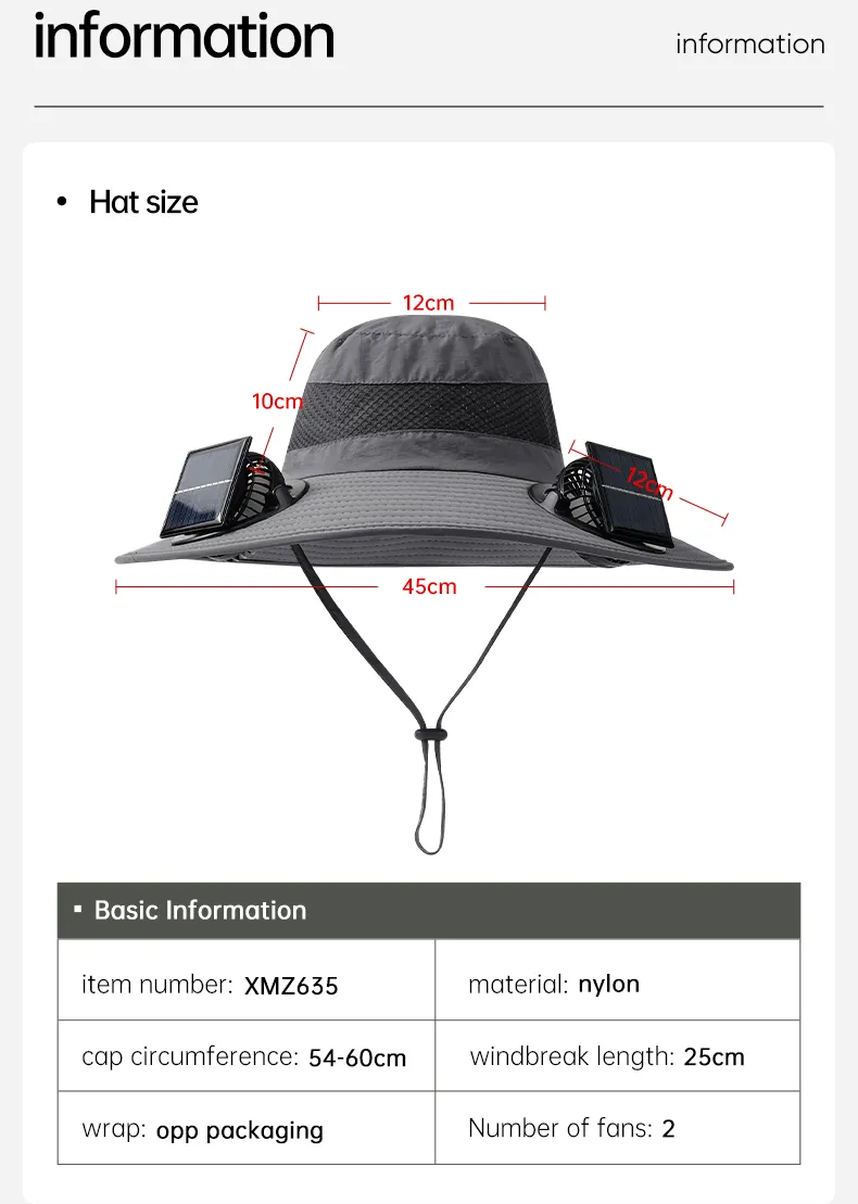 Long-Lasting Lithium Battery: The hat includes a long-lasting lithium battery that powers the fan when sunlight is
