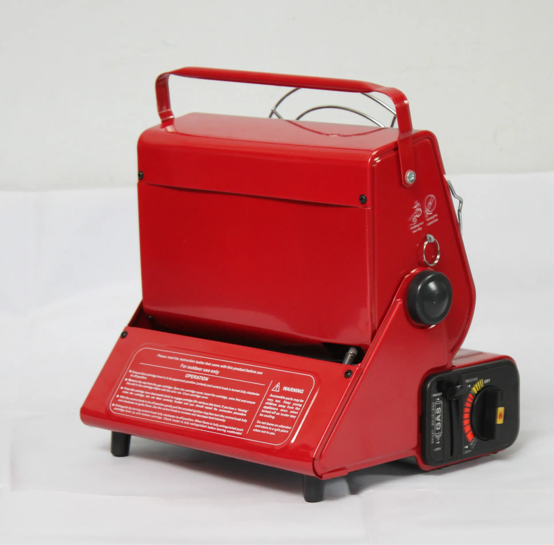 Function: dual purpose butane gas tank (can be used for heating and turning over to boil water for cooking)