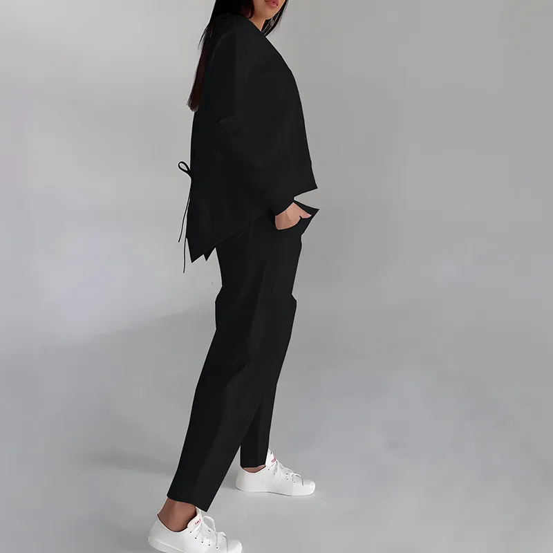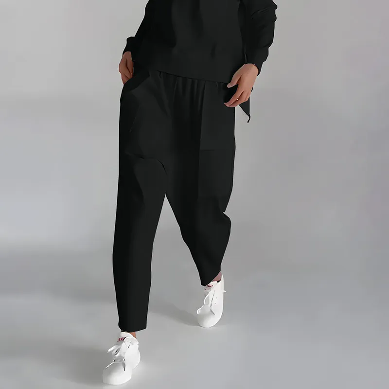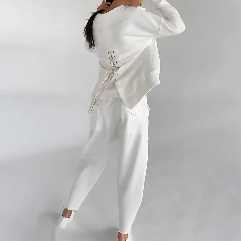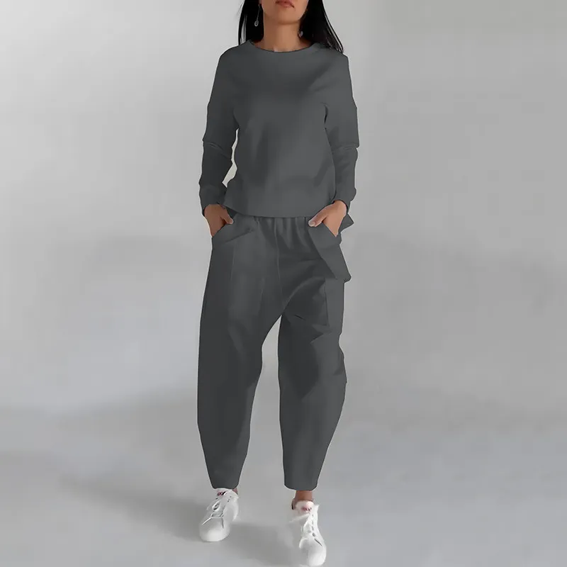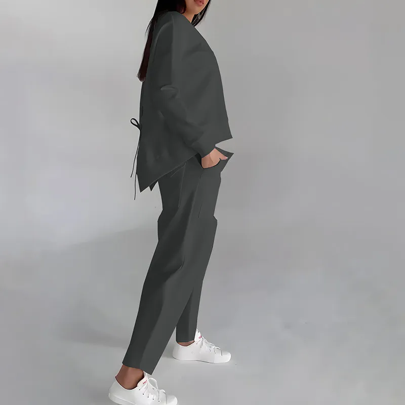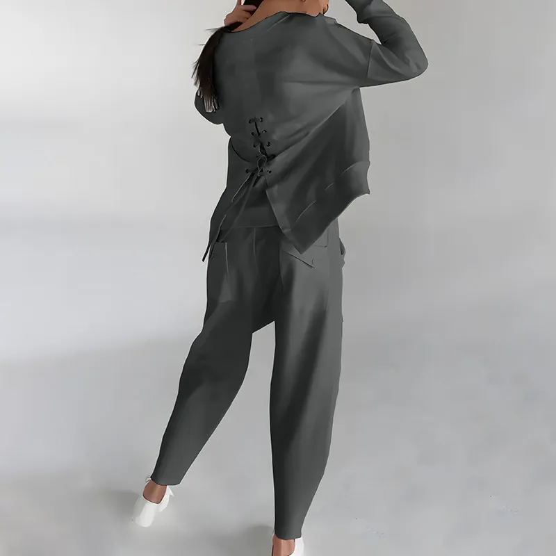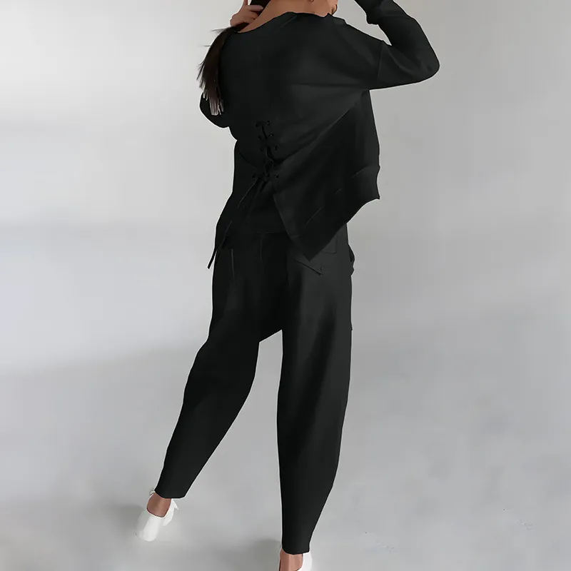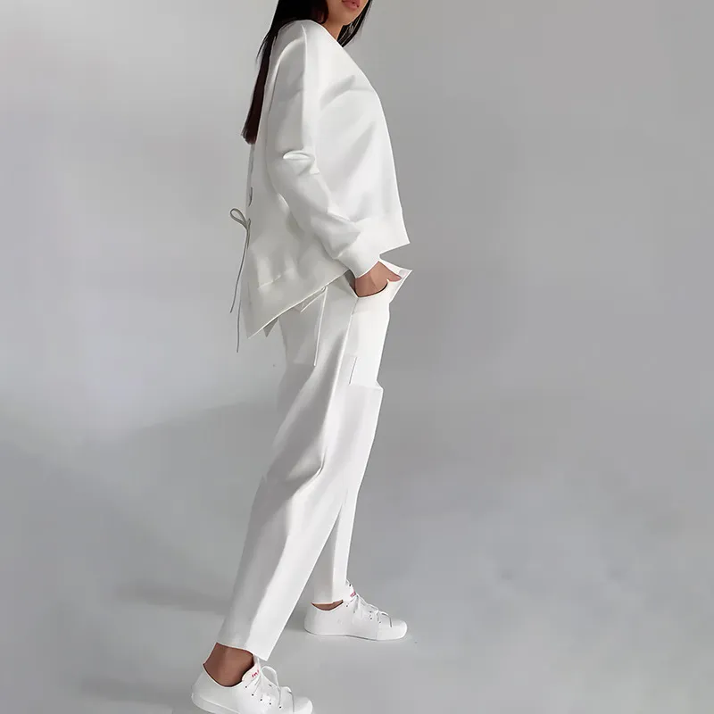 Solid Color Fashion Sweatshirt Long Sleeve Back Slit Top With Pockets Loose Trousers Women's Clothing