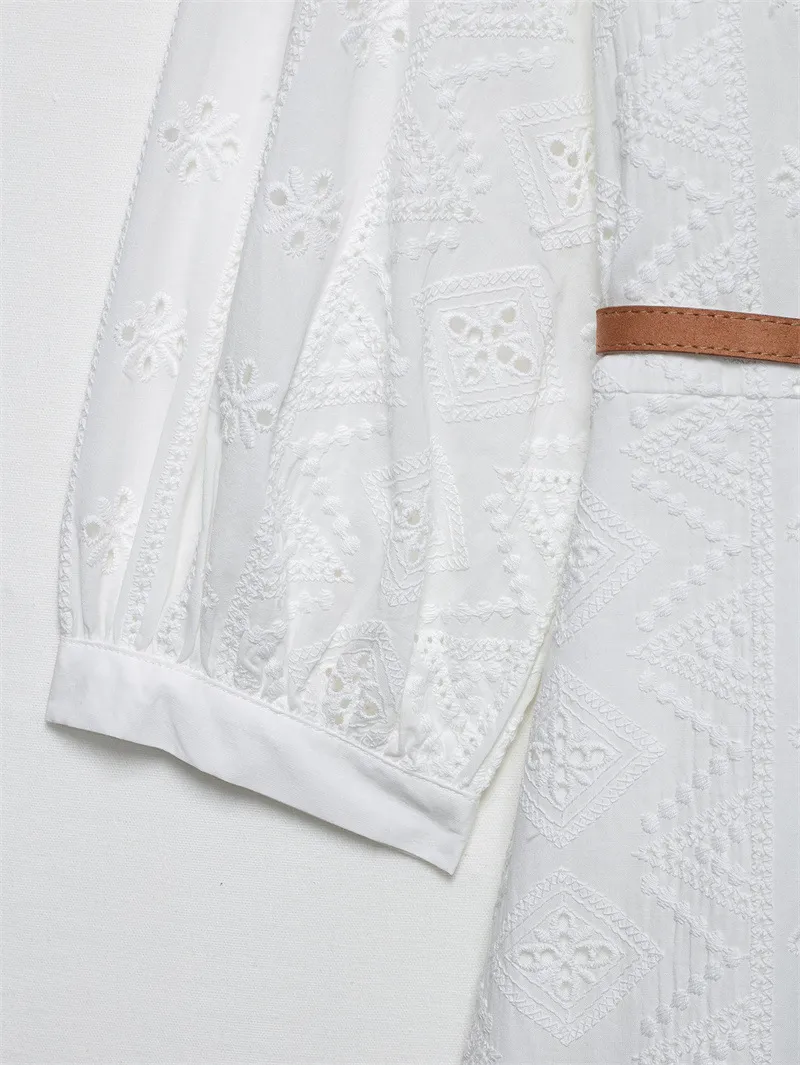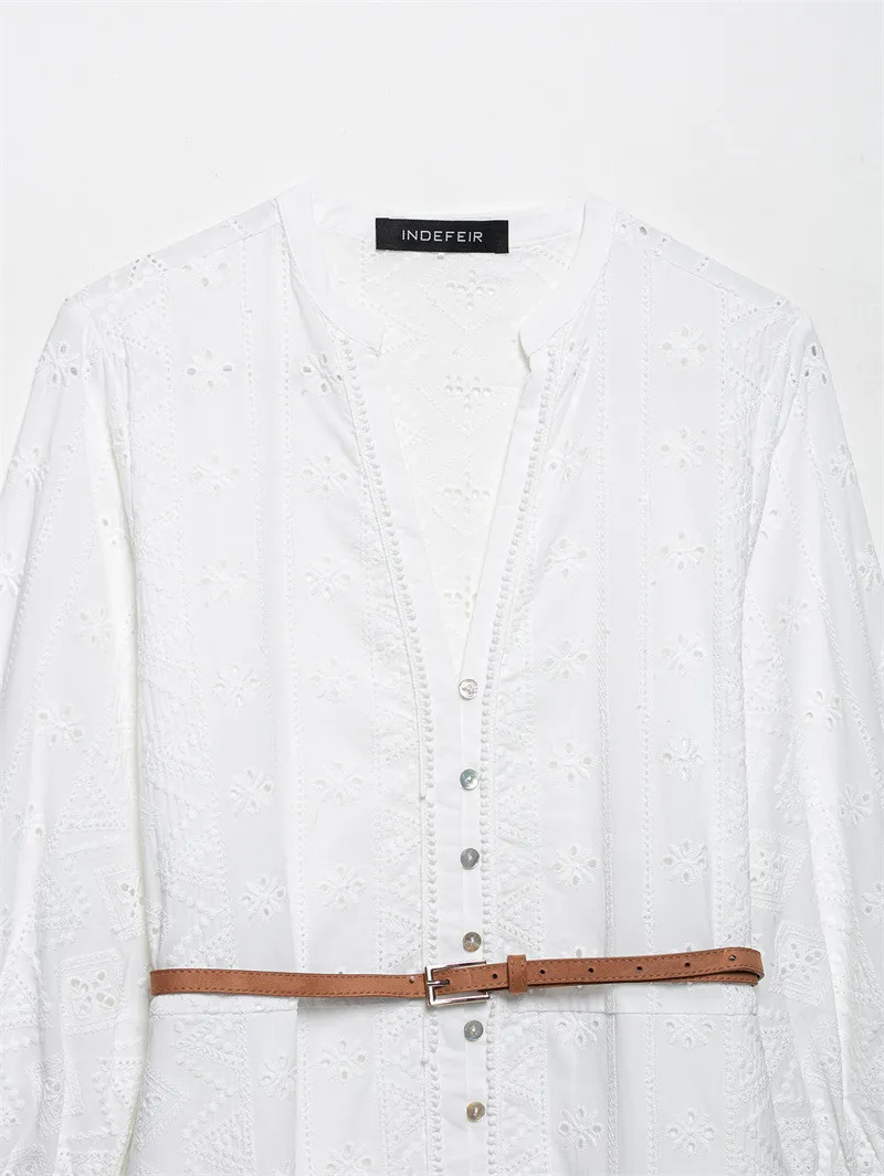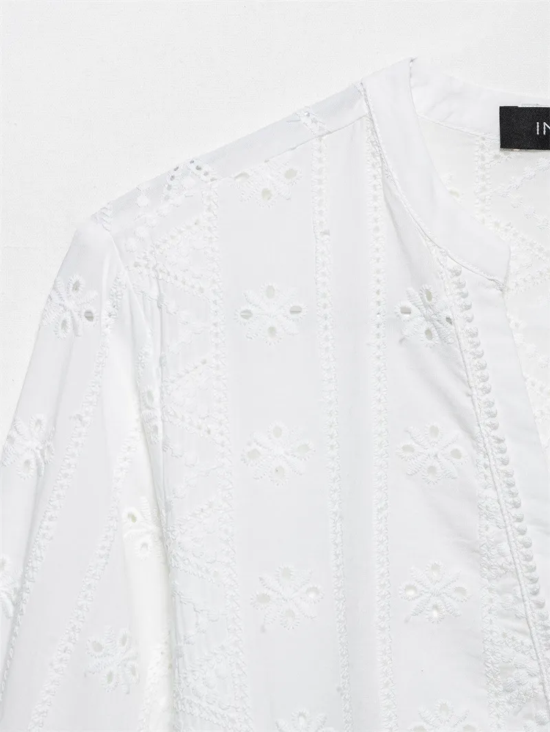Made from premium fabric, this dress is not only visually appealing but also comfortable to wear. The hollow embroidery pattern creates a stylish contrast with the solid color, adding a touch of femininity and refinement. The dress’s versatile design ensures that it pairs well with a range of accessories, from heels to flats, and can easily transition from day to night.