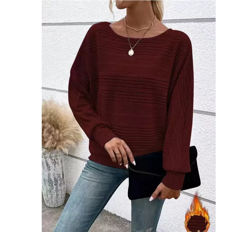 Solid Striped Batwing Sleeves T-shirt Fashion Casual Pullover Round Neck Long Sleeve Top Spring And Autumn Women's Clothing