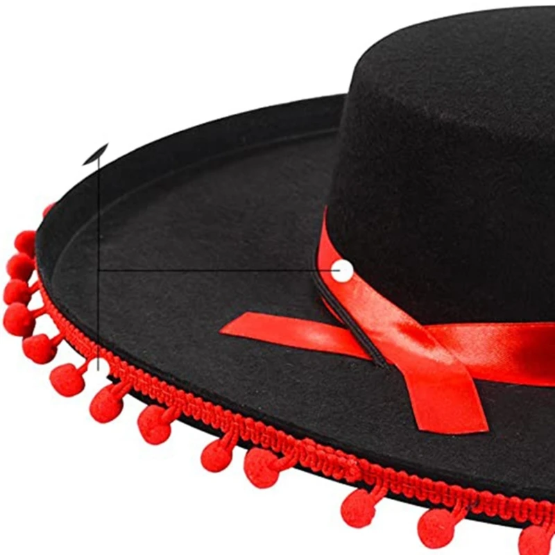 This sombrero-style top hat can be paired with a variety of outfits, from quirky costume pieces to more formal attire, allowing for versatile use across a wide range of events and occasions.