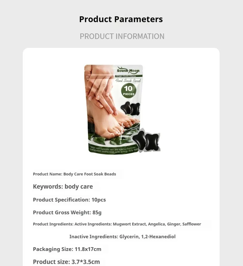 The South Moon Ginger Health Edema Foot Soak Bead is a herbal foot soak product formulated with ginger and other natural extracts designed to be dissolved in warm water for a relaxing foot bath. When added to your foot soak basin, these pre‑measured beads release beneficial herbal compounds that can help create a comforting, therapeutic soak. Ginger has traditionally been used in foot soaks to improve circulation, enhance warmth, and support comfort in swollen or fatigued feet. (Vinmec International Hospital)