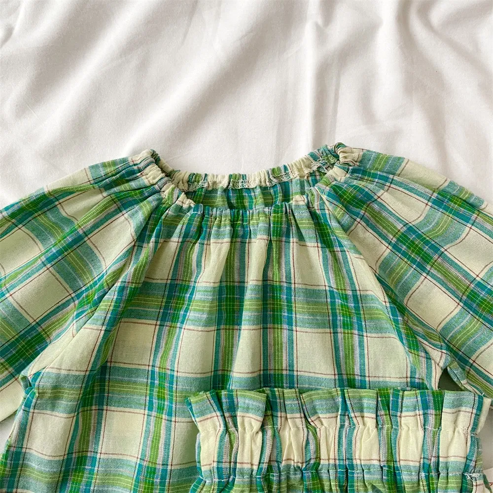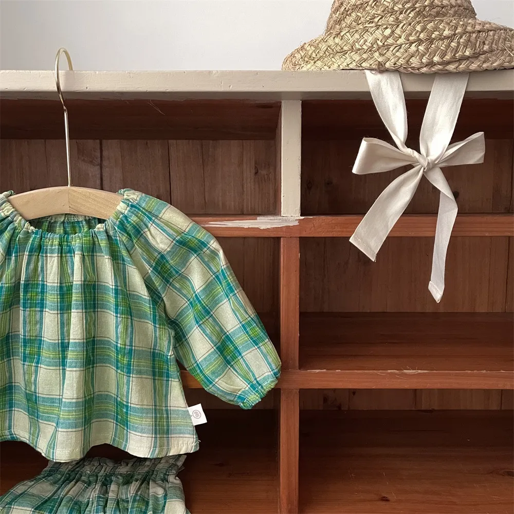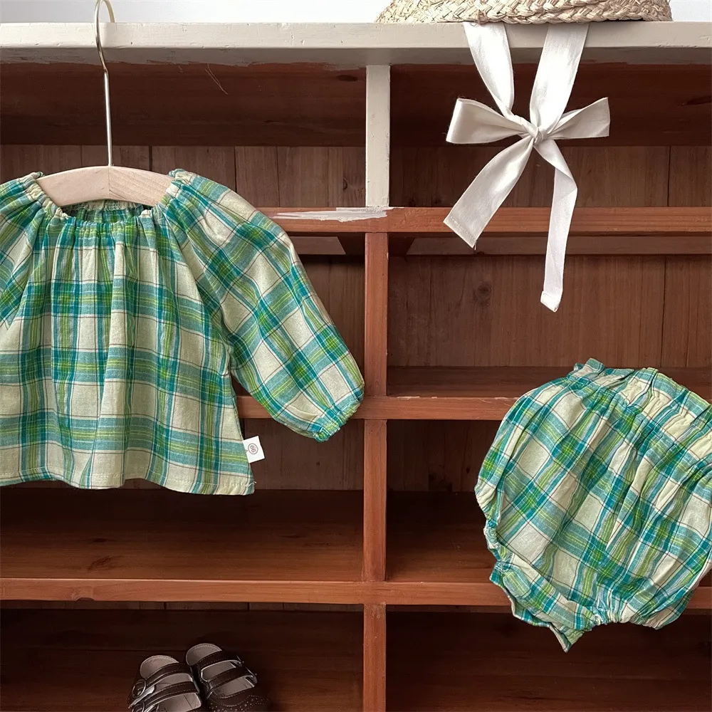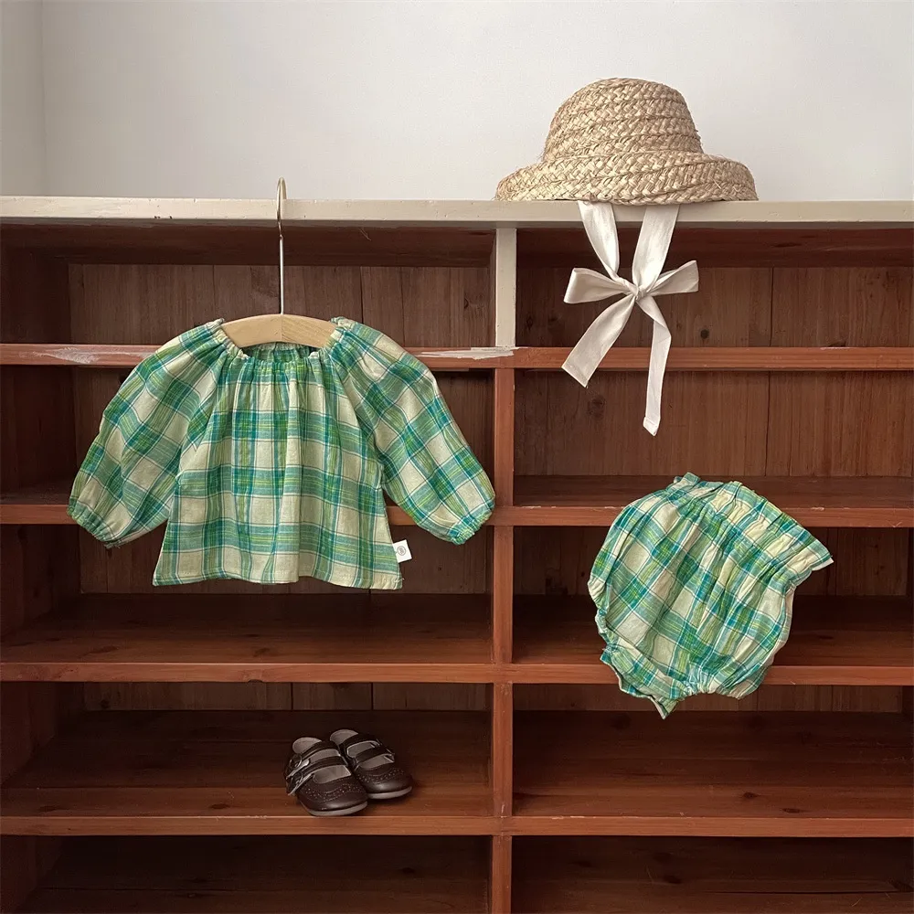Spring And Autumn Baby Green Plaid Long Sleeve Shorts Suit