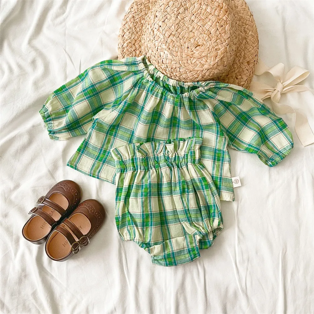Spring And Autumn Baby Green Plaid Long Sleeve Shorts Suit