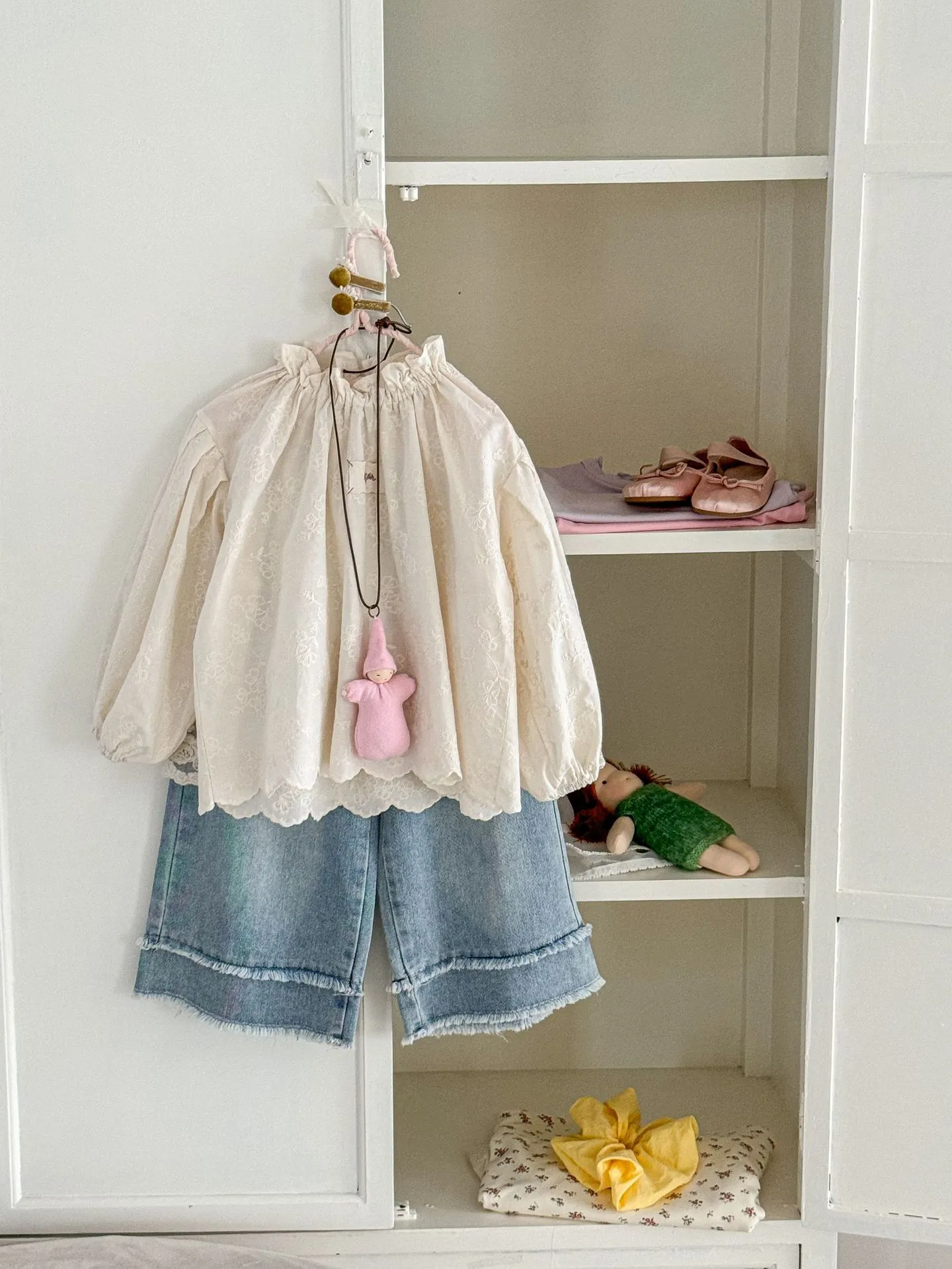 interest to the solid color fabric. The delicate patterns enhance the top’s appeal without overwhelming its simplicity.