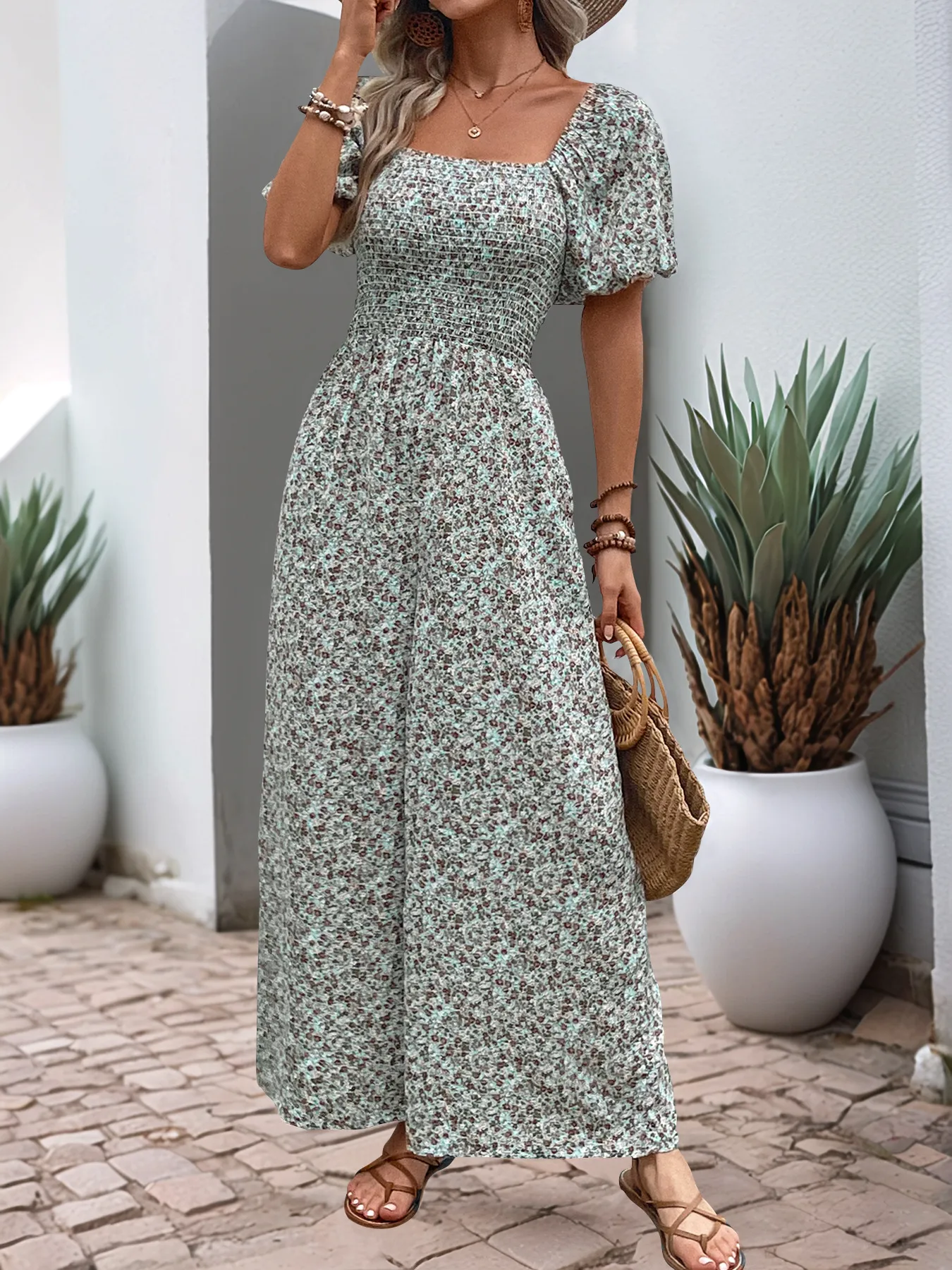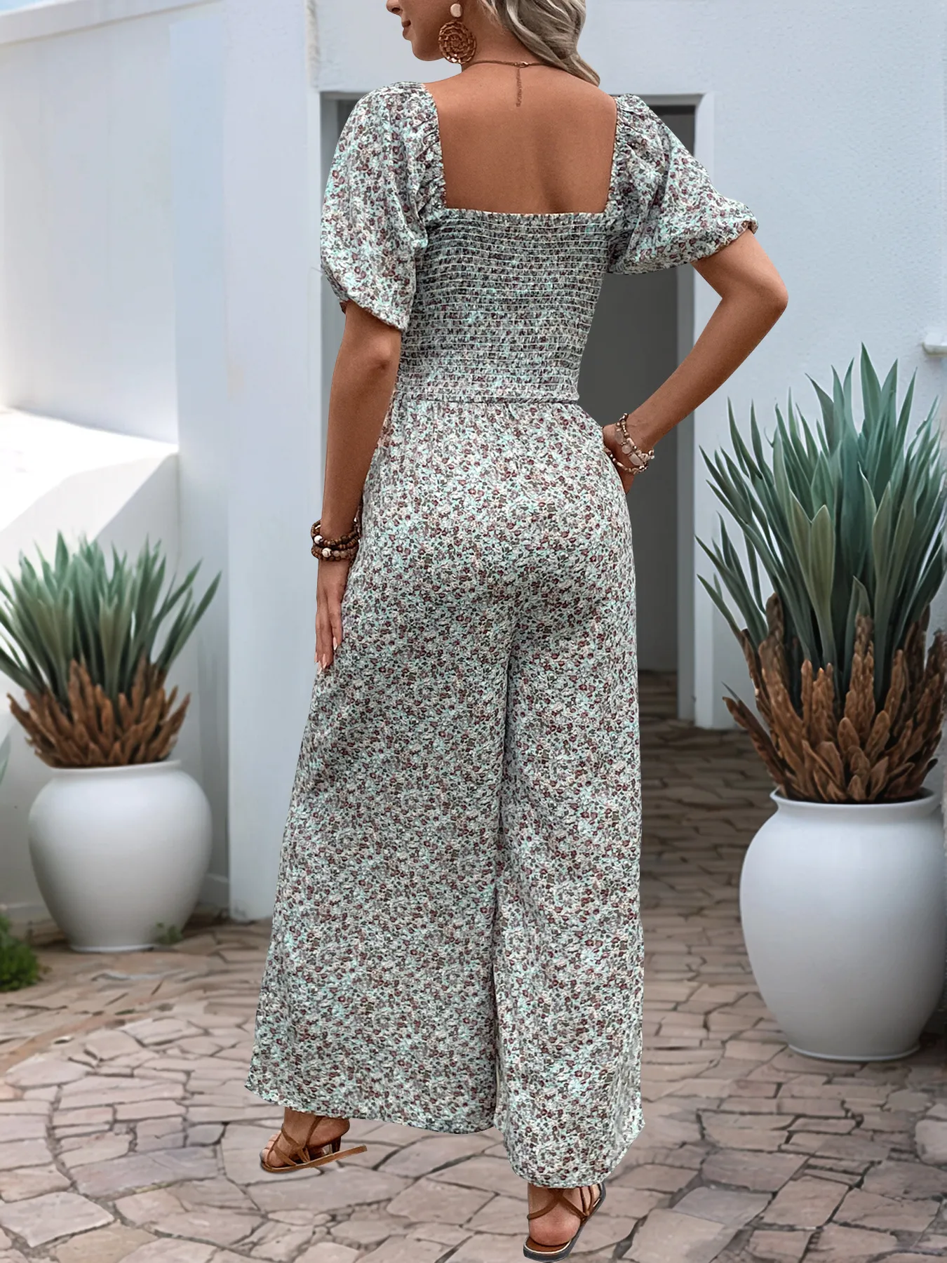 For a beautiful and versatile jumpsuit that seamlessly blends fashion and comfort, the Square Collar Puff Sleeve Vacation Style Floral