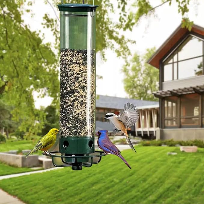 The tube bird feeder holds 3.5pounds of bird food and has four feeding openings and a circular perch, allowing multiple birds to feed simultaneously with a better view.