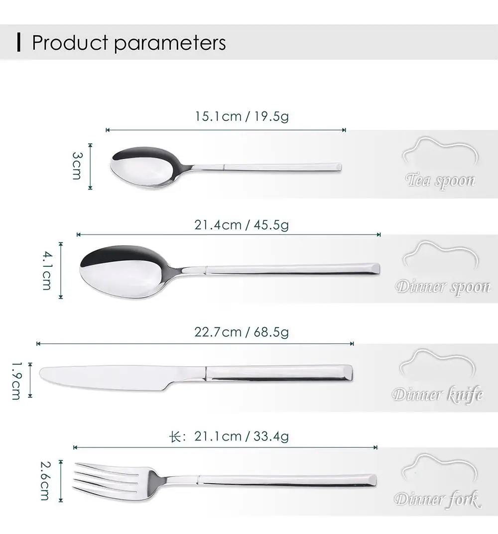 - Complete Set: Includes knives, forks, spoons, and teaspoons.