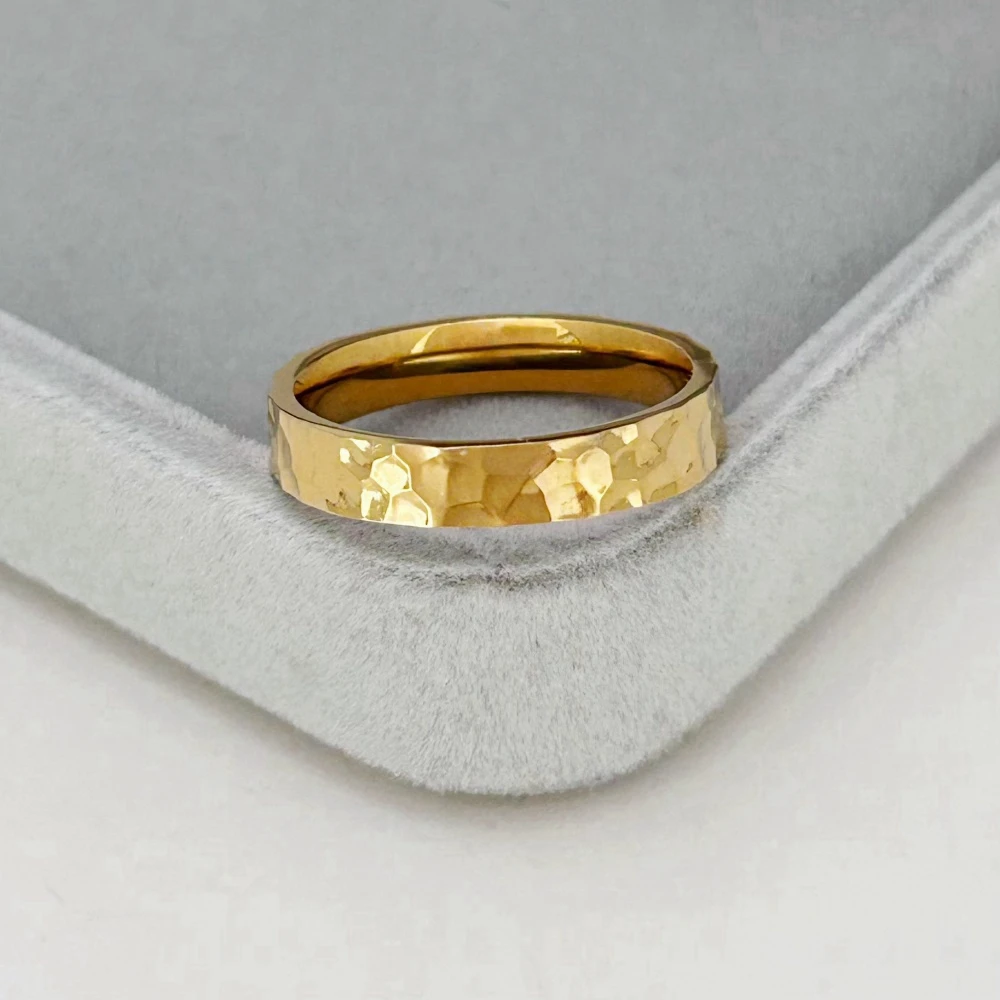 The Stainless Steel Gold Color 4mm Hammer Pattern Finger Rings for Men and Women offer a perfect combination of style, durability, and