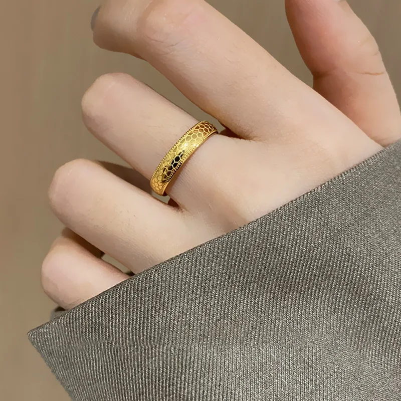 The standout feature of this ring is its distinctive honeycomb pattern, which adds an interesting geometric touch to its design. The intricate, yet minimalist, honeycomb pattern creates a textured effect that catches the light and adds depth to the overall look. This modern design makes the ring versatile, blending easily with both casual and formal outfits.
