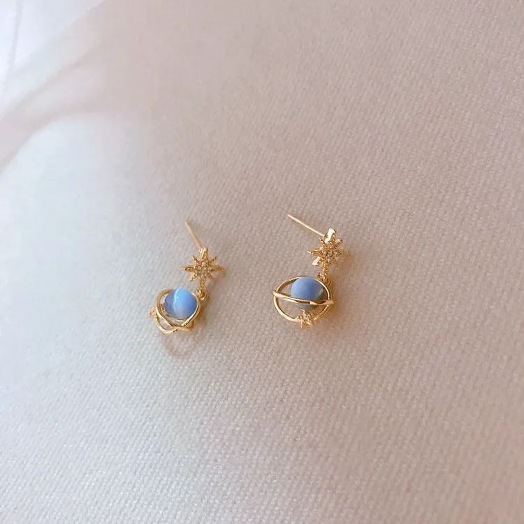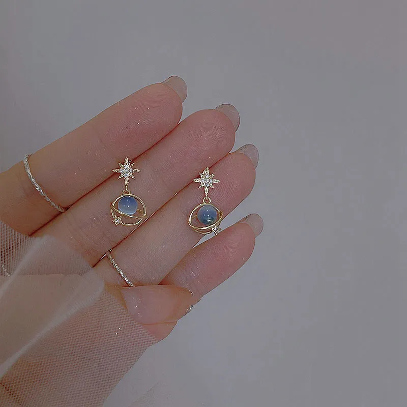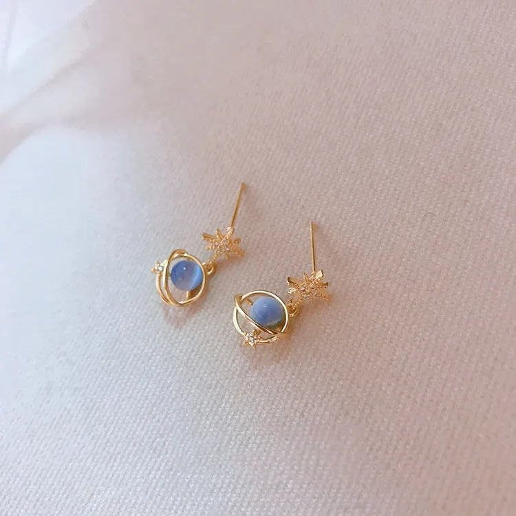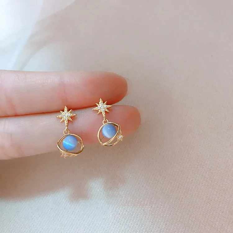 The blue opal stone and zircon accents add a radiant glow to your look, making these earrings perfect for those who love to express their unique style. Their celestial design evokes the mystery and beauty of the universe, making them a standout accessory for any outfit.