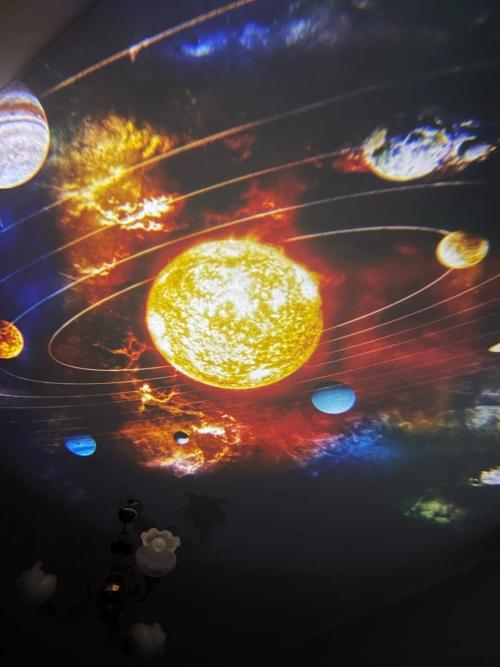 - 【HD Projection & Adjustable Focus】-- Rotating the top focusing head to adjust image clarity regardless of the projection distance. Support a projection distance of up to 16.4ft and an area of 754 sq ft. With 360° rotatable angle, the solar system projector can be projected onto the ceiling, walls, and floors