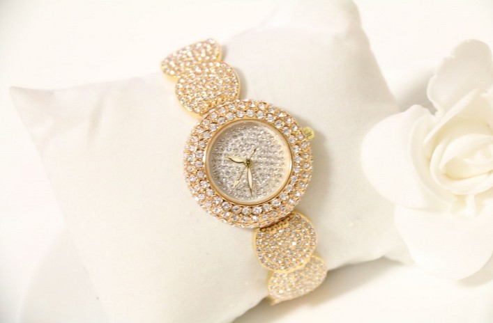 This watch is lavishly decorated with crystals or diamonds, either fully encrusting the dial and bezel or featuring as accents. The sparkling embellishments catch the light beautifully, making the watch a stunning accessory for any occasion.
