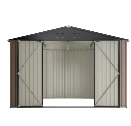 【Durable & Sturdy Outdoor Sheds Storage】- Storage Shed 10' x 10' . Durable construction with galvanized steel reinforcement makes this durable metal outdoor storage shed rustproof and UV-resistant. Overlapped wall panels features with waterproof and moister-resistant, worry-free for all weather condition use.