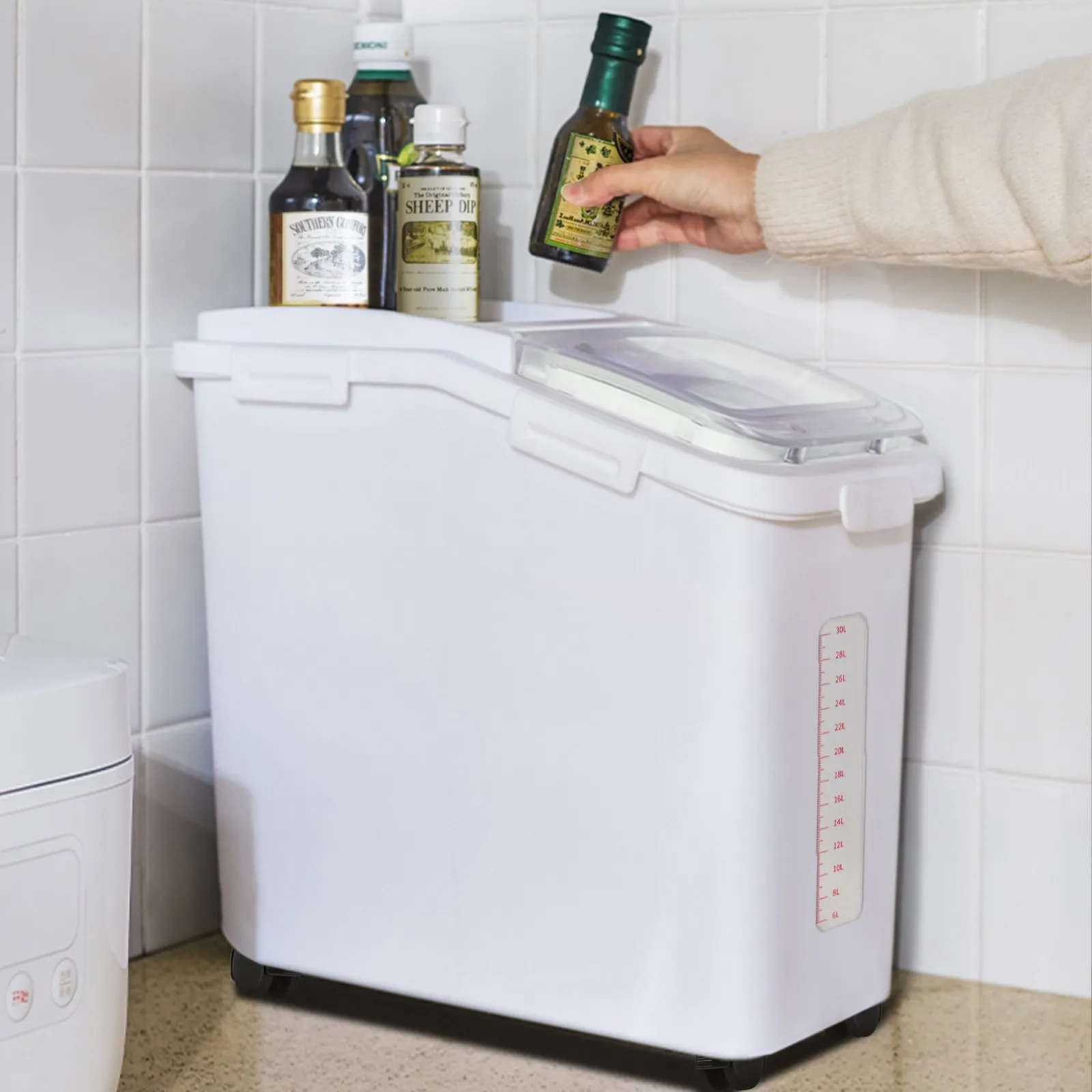 Smooth Rolling Wheels: Equipped with durable wheels, the bin moves easily across various surfaces, including carpet, tile,