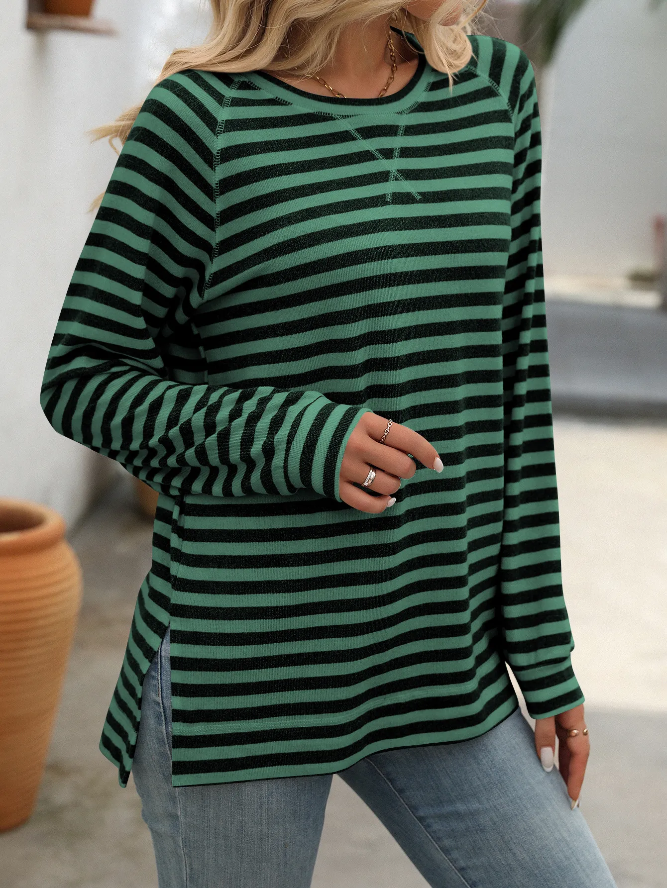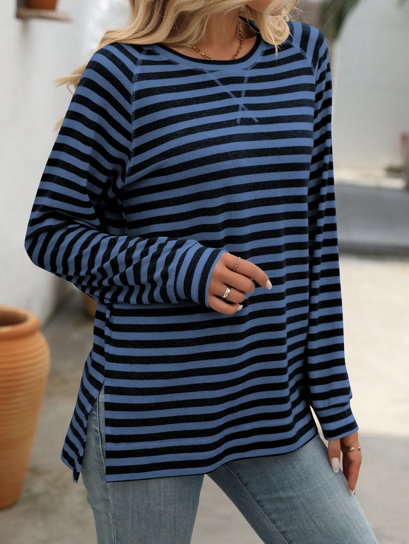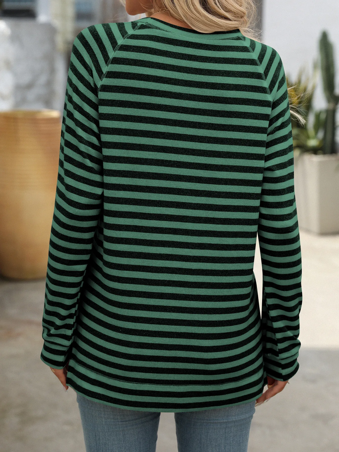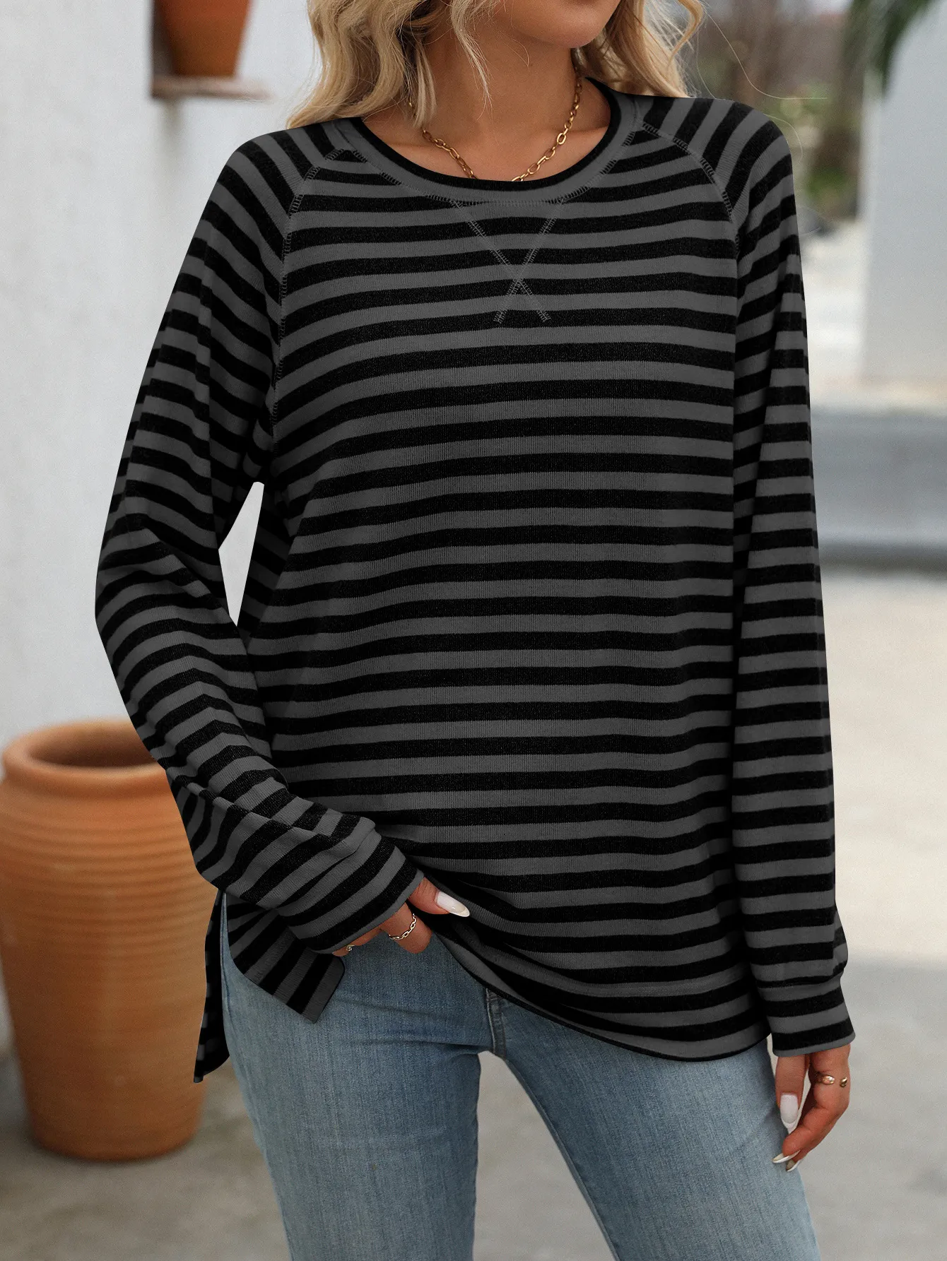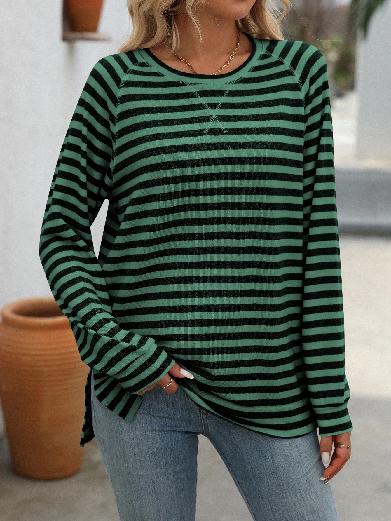 Striped Contrast Color Round Neck Long Sleeve Loose-fitting T-shirt Top
