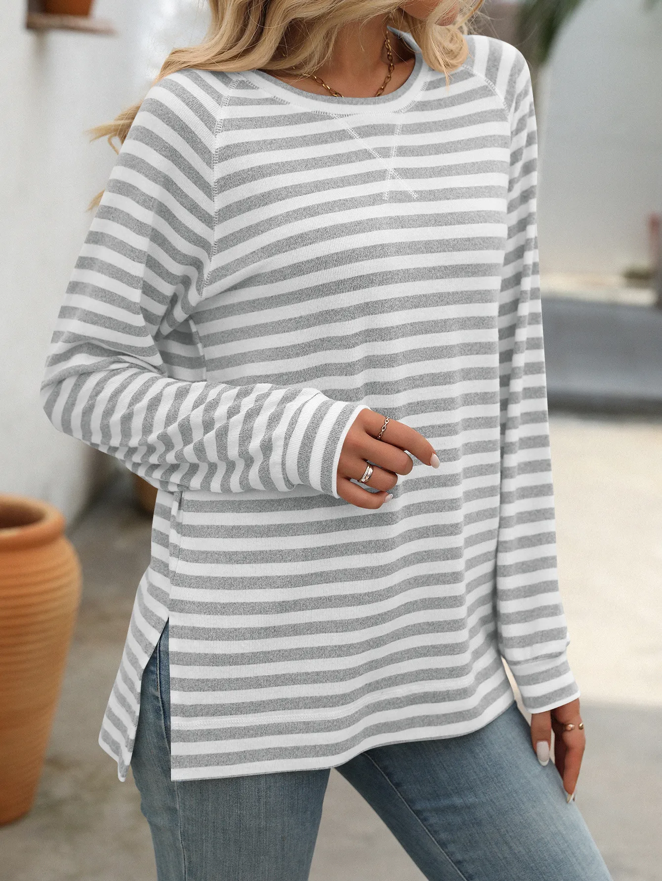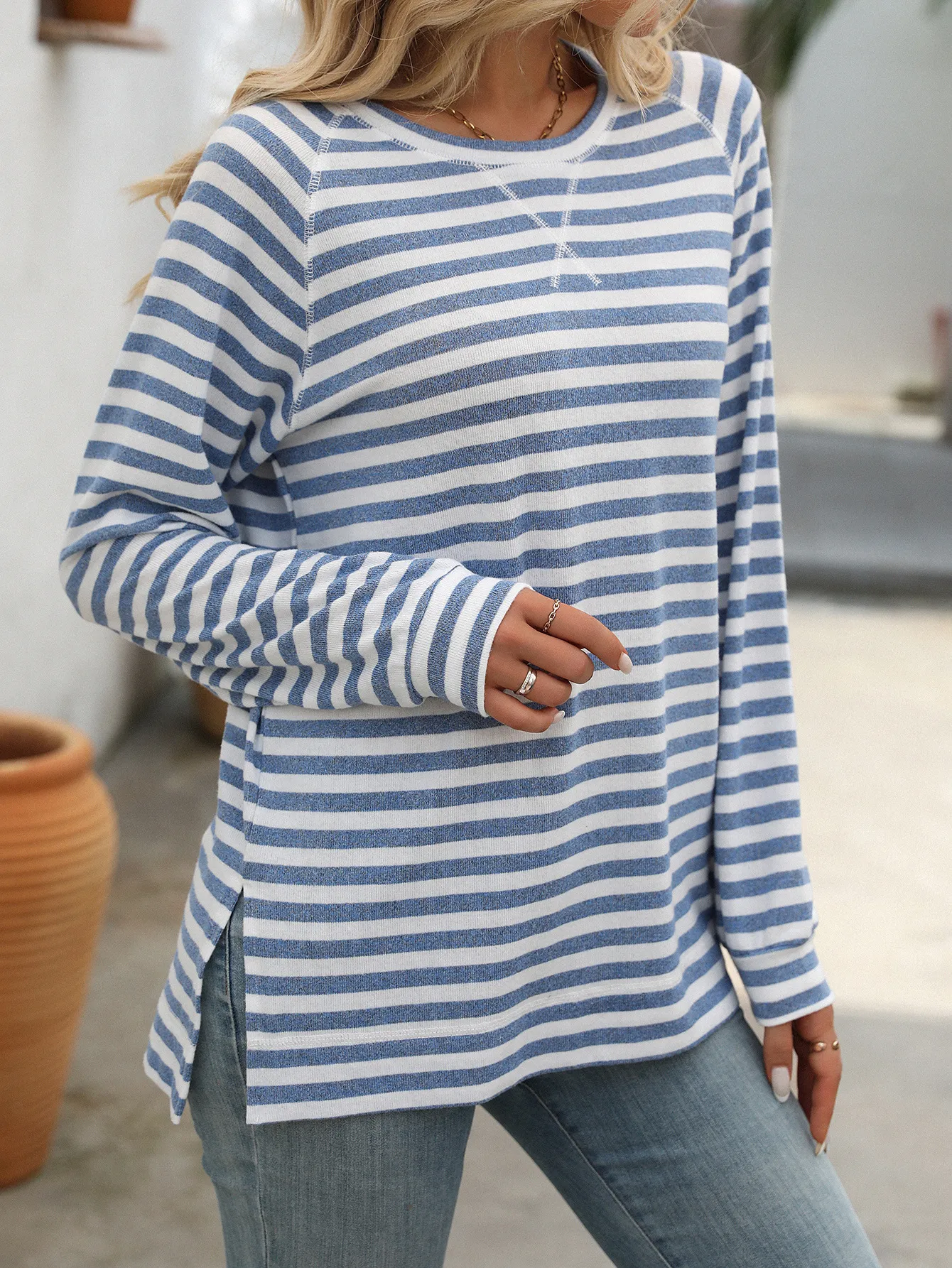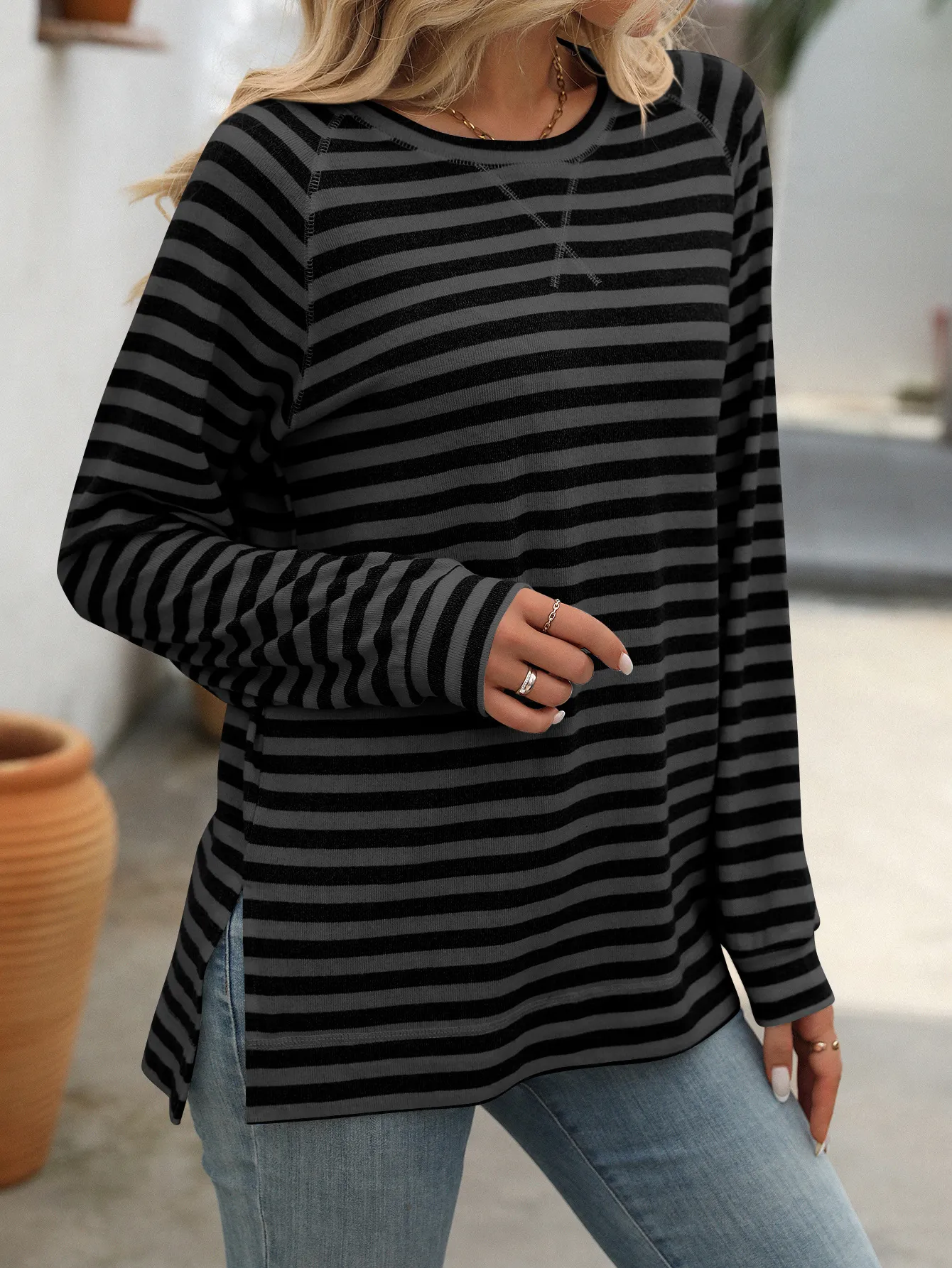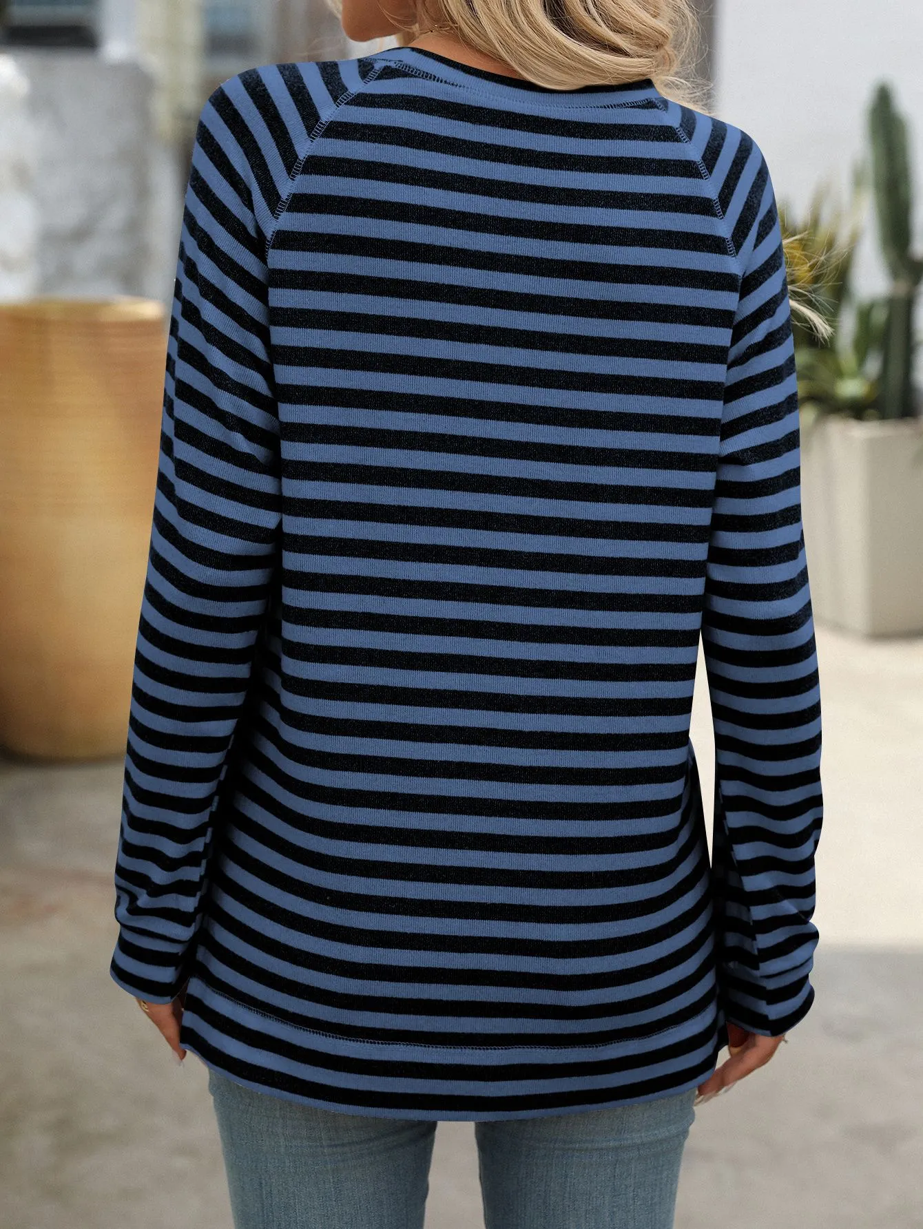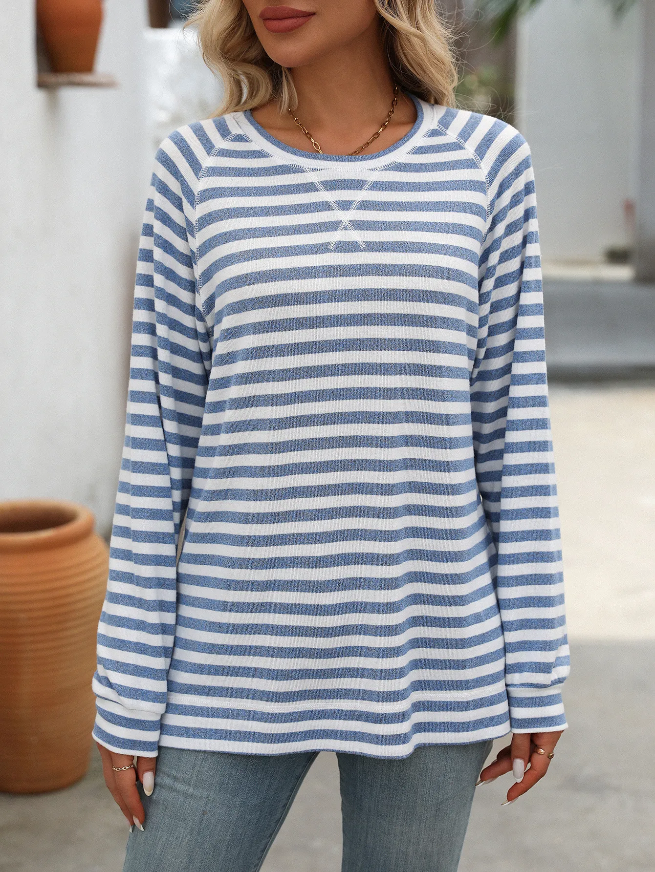 Striped Contrast Color Round Neck Long Sleeve Loose-fitting T-shirt Top