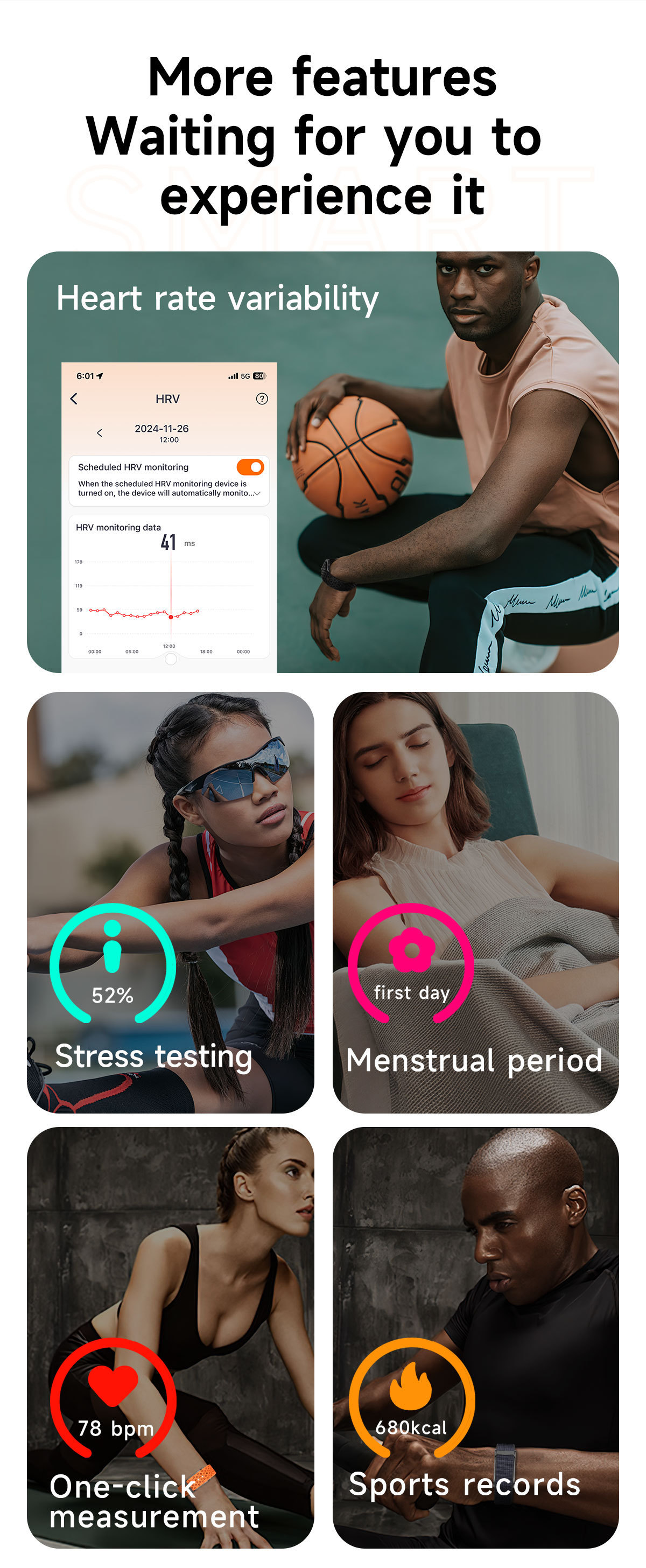 Functions: Waterproof, step counting, heart rate monitoring, blood pressure measurement, Bluetooth calling, smart reminder, sleep