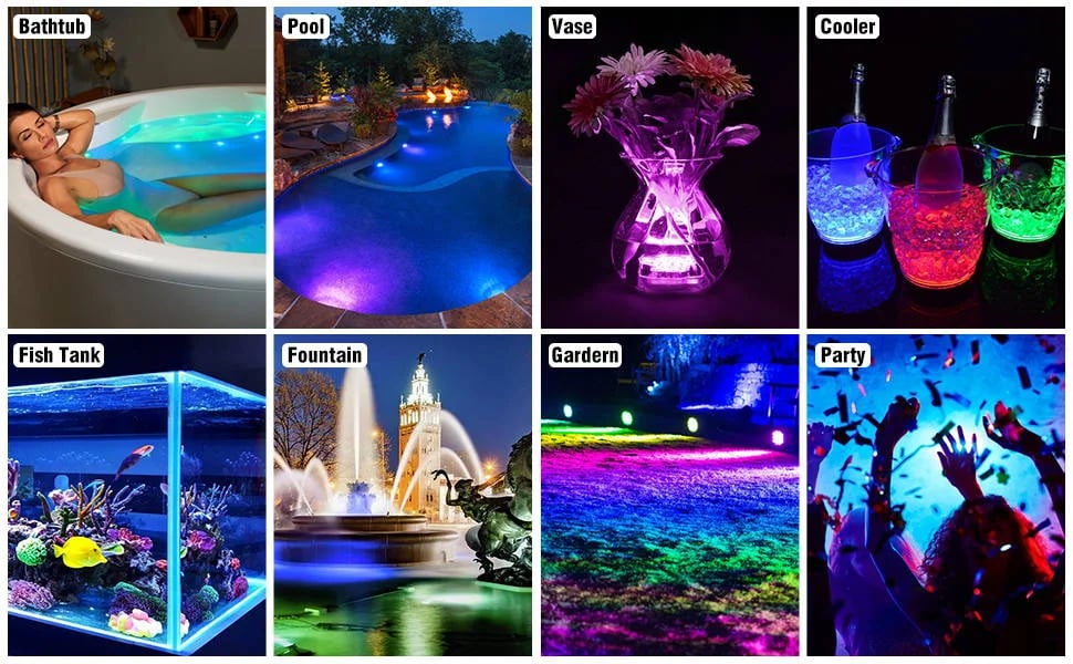 Waterproof submersible lights with suction cups, and upgraded full waterproof weatherproof structure, it works well in both wet and dry places, such as swimming pool light, pond light, boat, foundation, aquarium, fish tank, vase, flower pot, waterfall, bathtub, hot tub, and hallway, basement, garage, state, wedding, event, party as decor light, ambiance light, or night light indoor and outdoor decoration