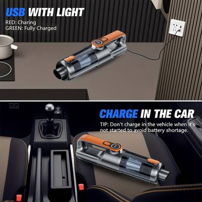 This vacuum features a cartridge filter and a dust cup volume of 0.2-0.3L, providing an ample space for dirt collection without needing frequent emptying. Its blow and suction integrated feature allows for dual functionality, so you can not only vacuum but also blow debris away when necessary. The USB charging feature means you can easily recharge the vacuum from a variety of devices, including power banks or laptops, making it convenient for use anywhere, whether at home, in your car, or on the go.